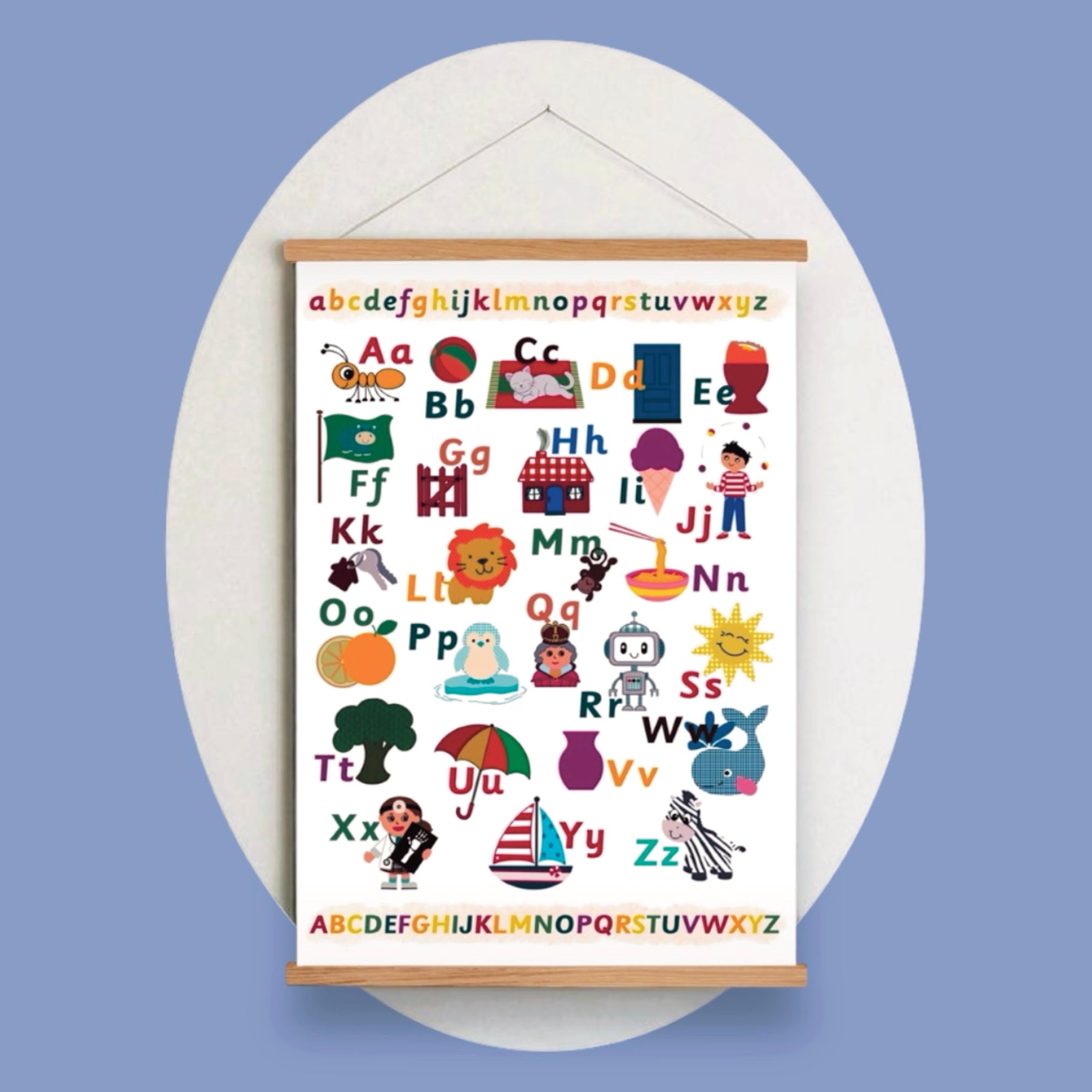 This A1 size alphabet poster combines educational value with fine art quality, making it an ideal addition to any learning environment. Printed on high-quality material, it features vibrant, clear letters designed to engage and educate. The poster comes complete with natural wood hangers, allowing for easy and stylish display. Perfect for classrooms, nurseries, or home study areas, it supports early literacy development while enhancing the space with its artistic appeal.