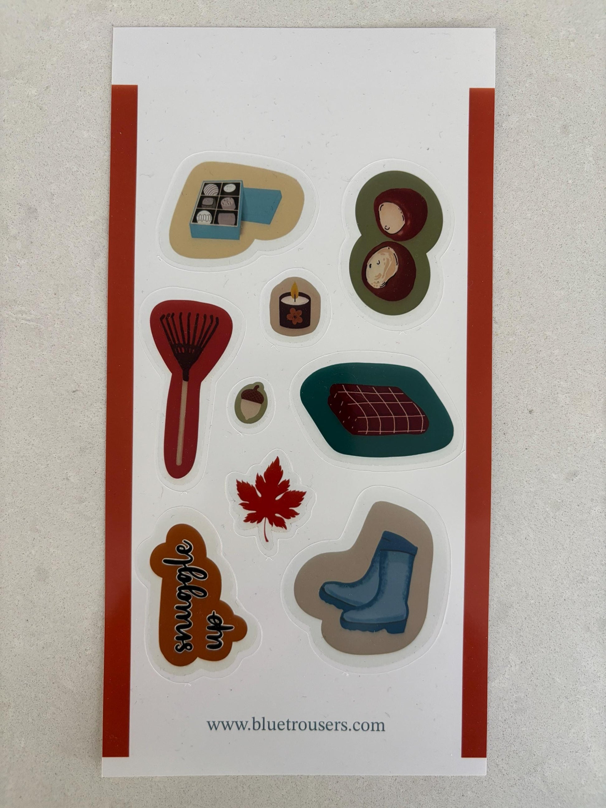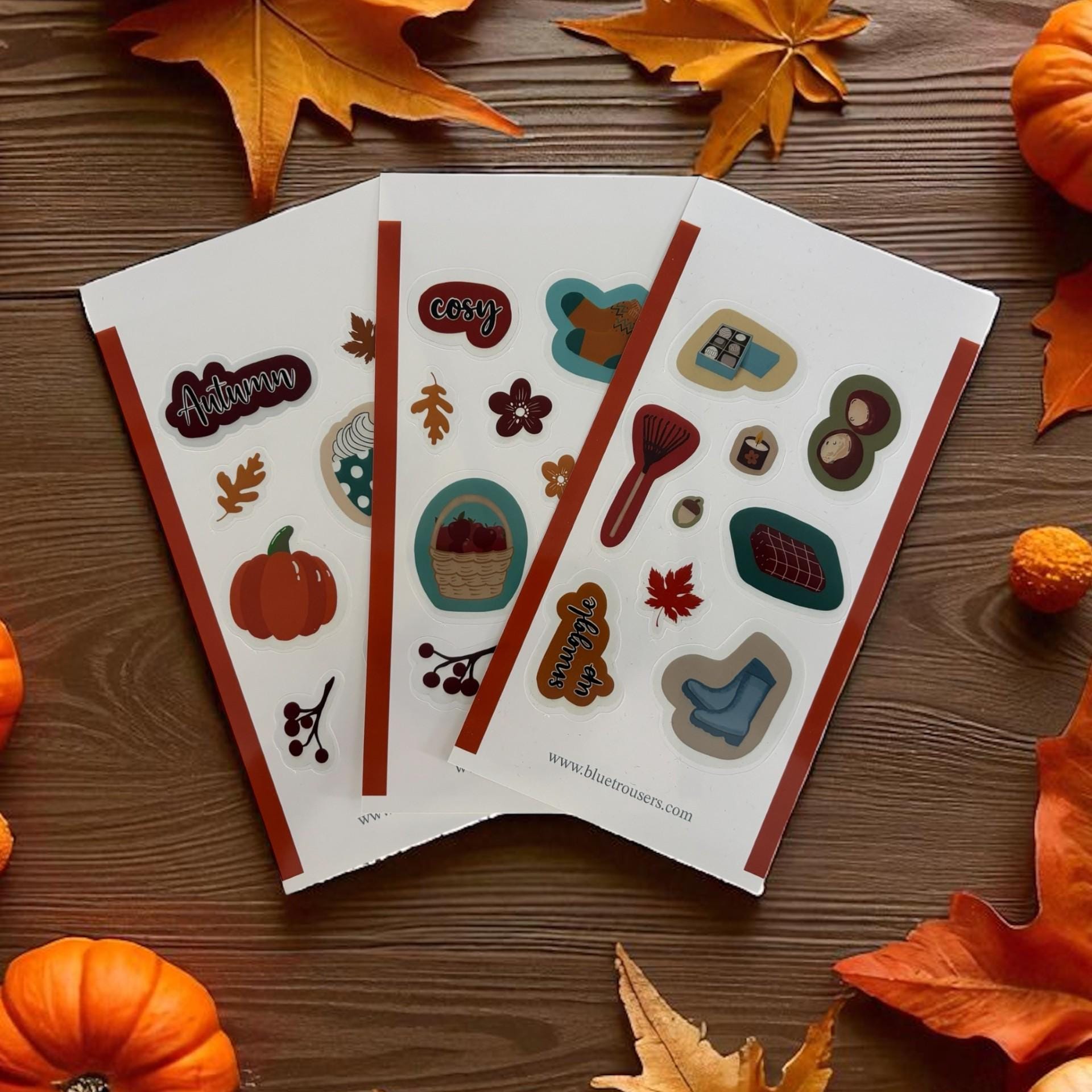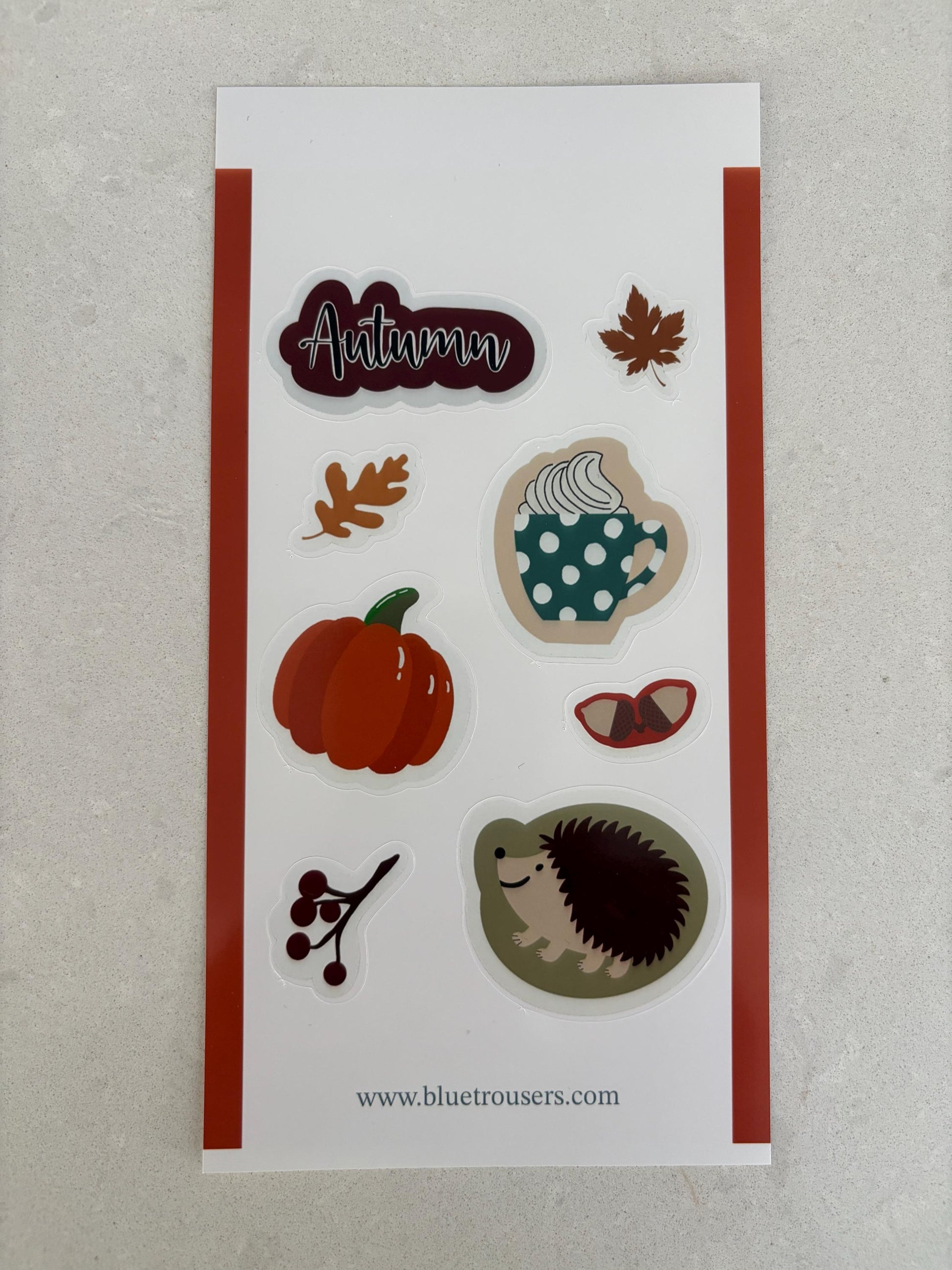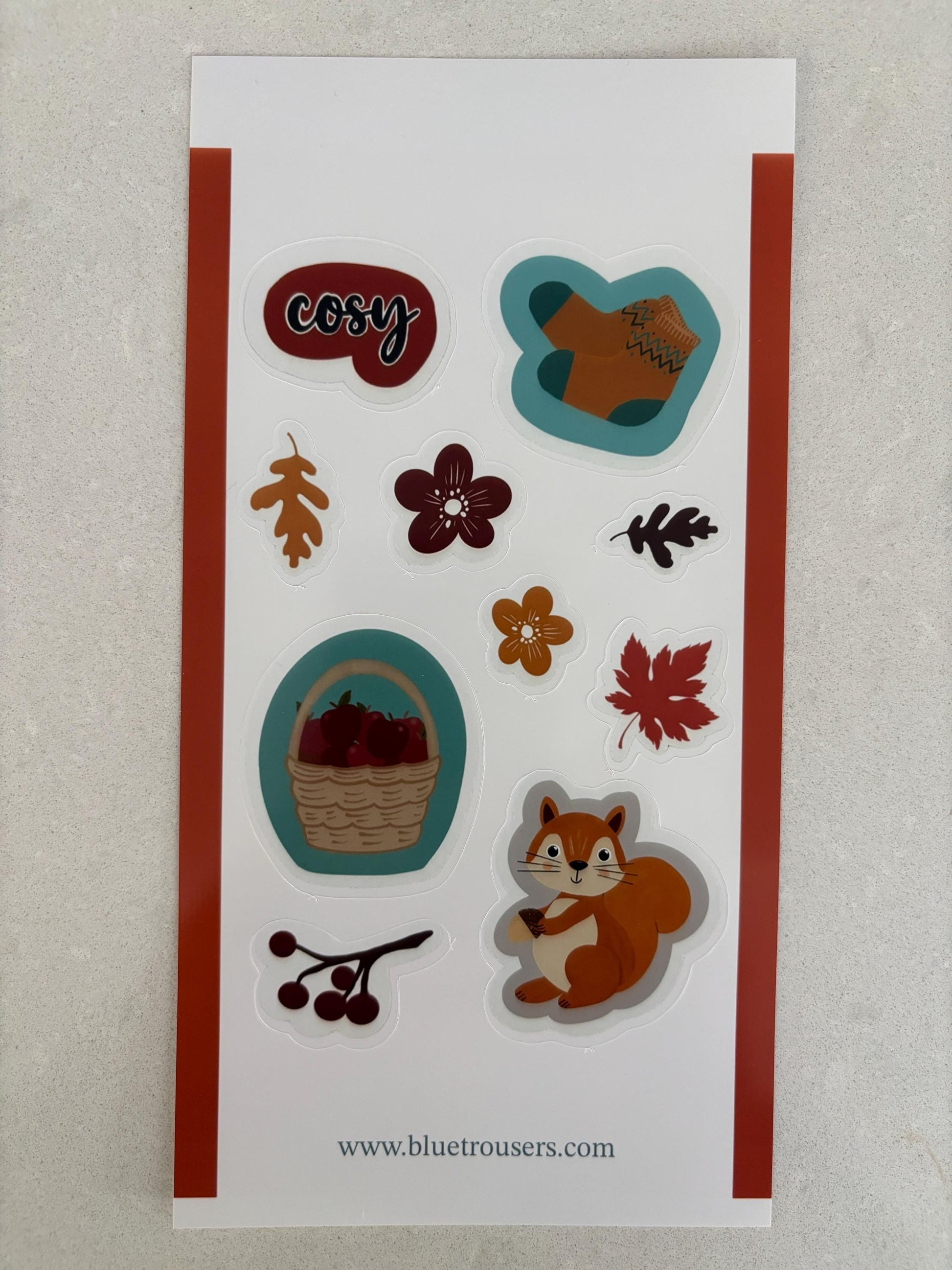 Twenty seven fun vinyl stickers featuring a variety of autumnal objects and messages, designed and printed by us here in the UK. Each colour sticker is a different original design, and comes kiss cut following the outline of image. The stickers are supplied on three sheets, and are easy to peel and have a long-lasting glue that works well on any smooth surfaces including paper, card, wood, laptops, phone cases, journals, scrapbooks, and water bottles. The vinyl material is durable and water resistant, and the sticker sizes range in size from 1.5cm by 1.2cm for the acorn to 4.5cm by 4.1cm for the squirrel. Each sheet measures 4” x 7” (approximately 10cm x 18cm).