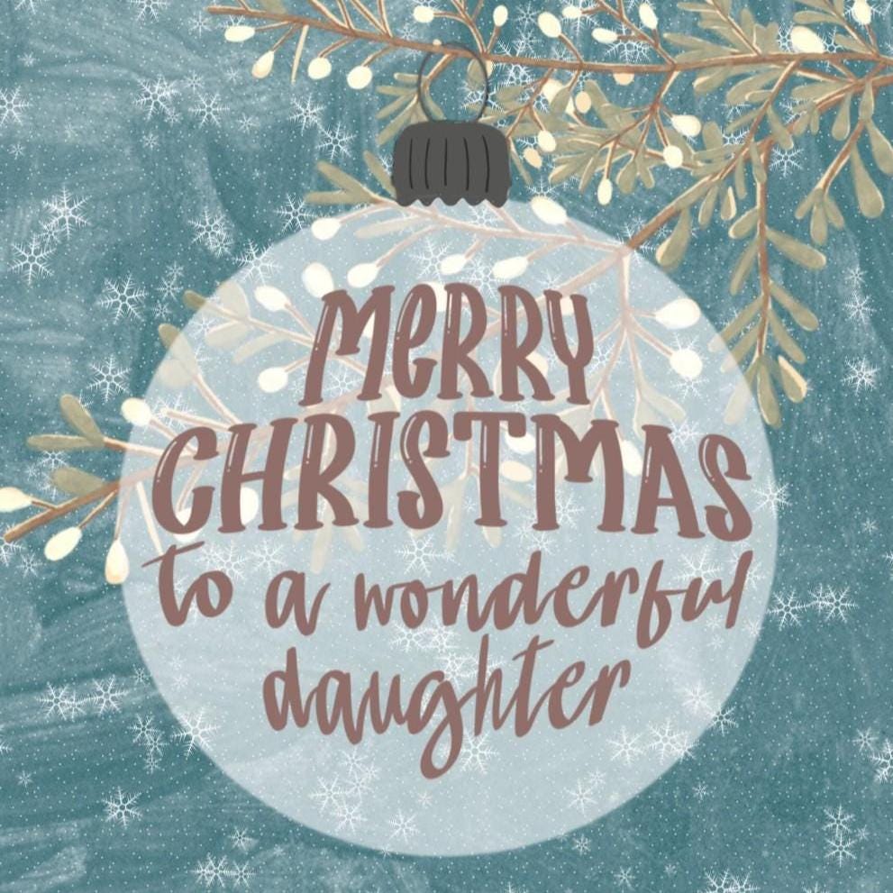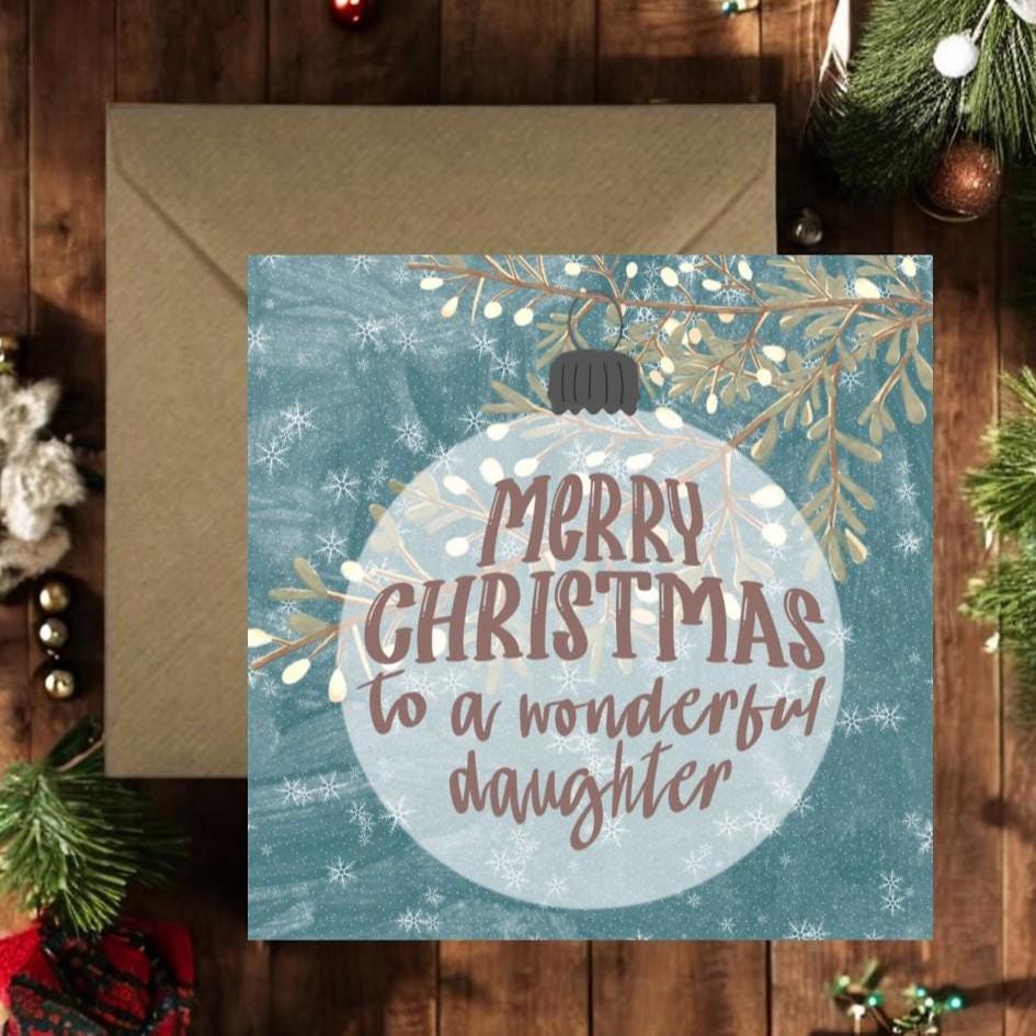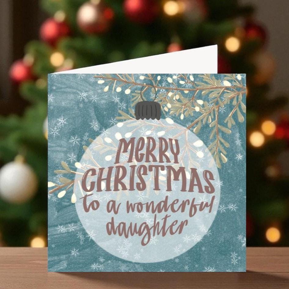 This classic Christmas card features a beautiful bauble and is perfect wishing a Merry Christmas to a wonderful daughter. It is an original Blue Trousers design, which is printed in the UK on high quality, sustainably sourced 324gsm card. This Christmas card measures 5.5 by 5.5 inches (14cm by 14cm), is supplied with a brown recycled kraft paper envelope, and comes safely packaged in a biodegradable plastic wrapper. Printed on the inside of the card is the message "Merry Christmas".