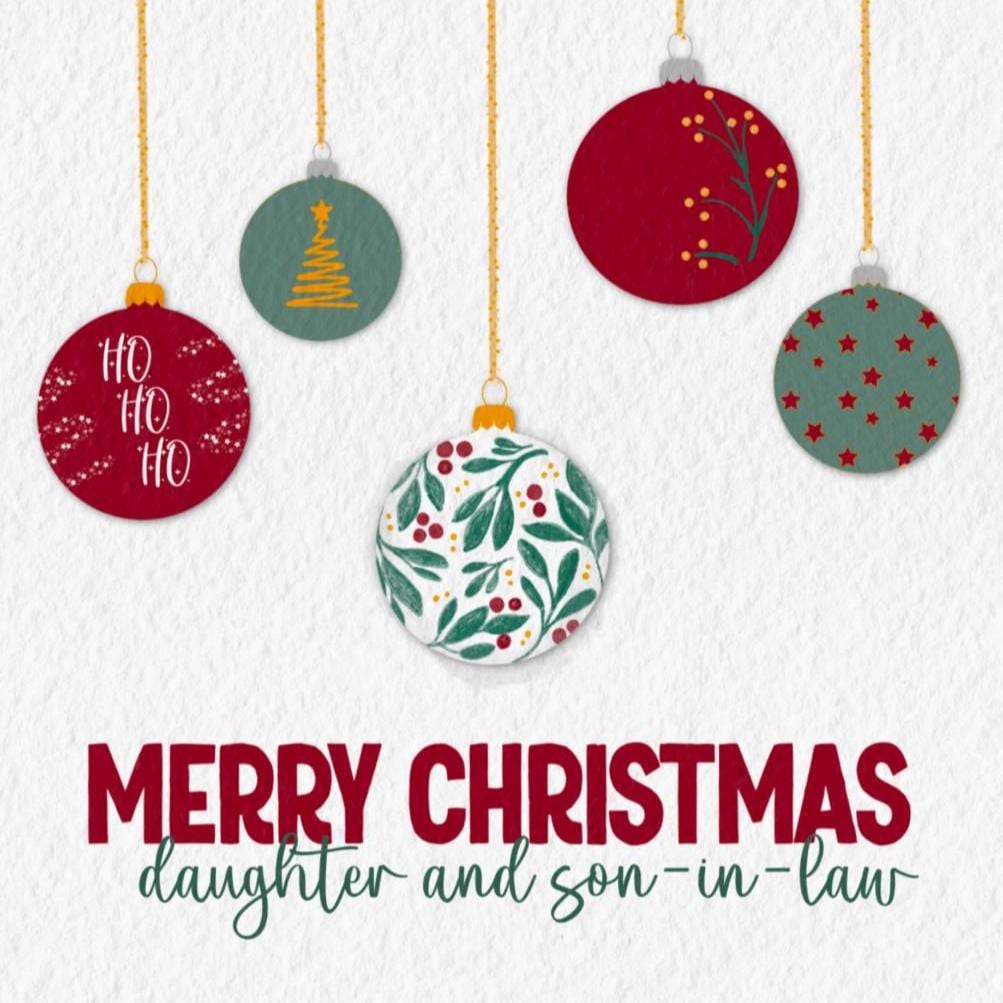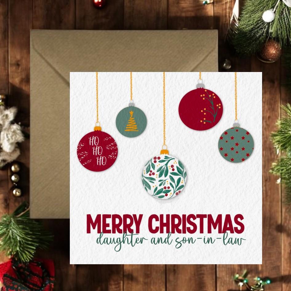 This classic Christmas card features colourful baubles and is perfect wishing a Merry Christmas to your daughter and son-in-law. It is an original Blue Trousers design, which is printed in the UK on high quality, sustainably sourced 324gsm card. This Christmas card measures 5.5 by 5.5 inches (14cm by 14cm), is supplied with a brown recycled kraft paper envelope, and comes safely packaged in a biodegradable plastic wrapper. Printed on the inside of the card is the message "Merry Christmas".