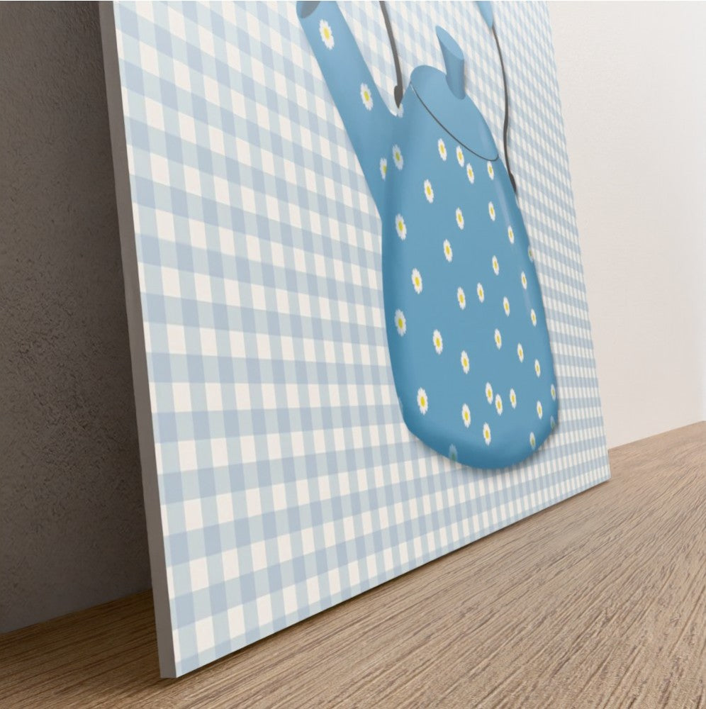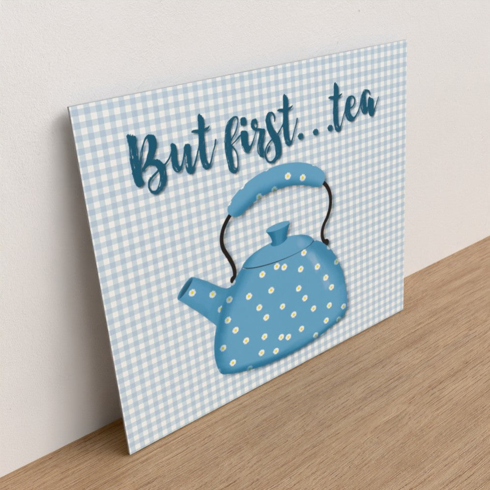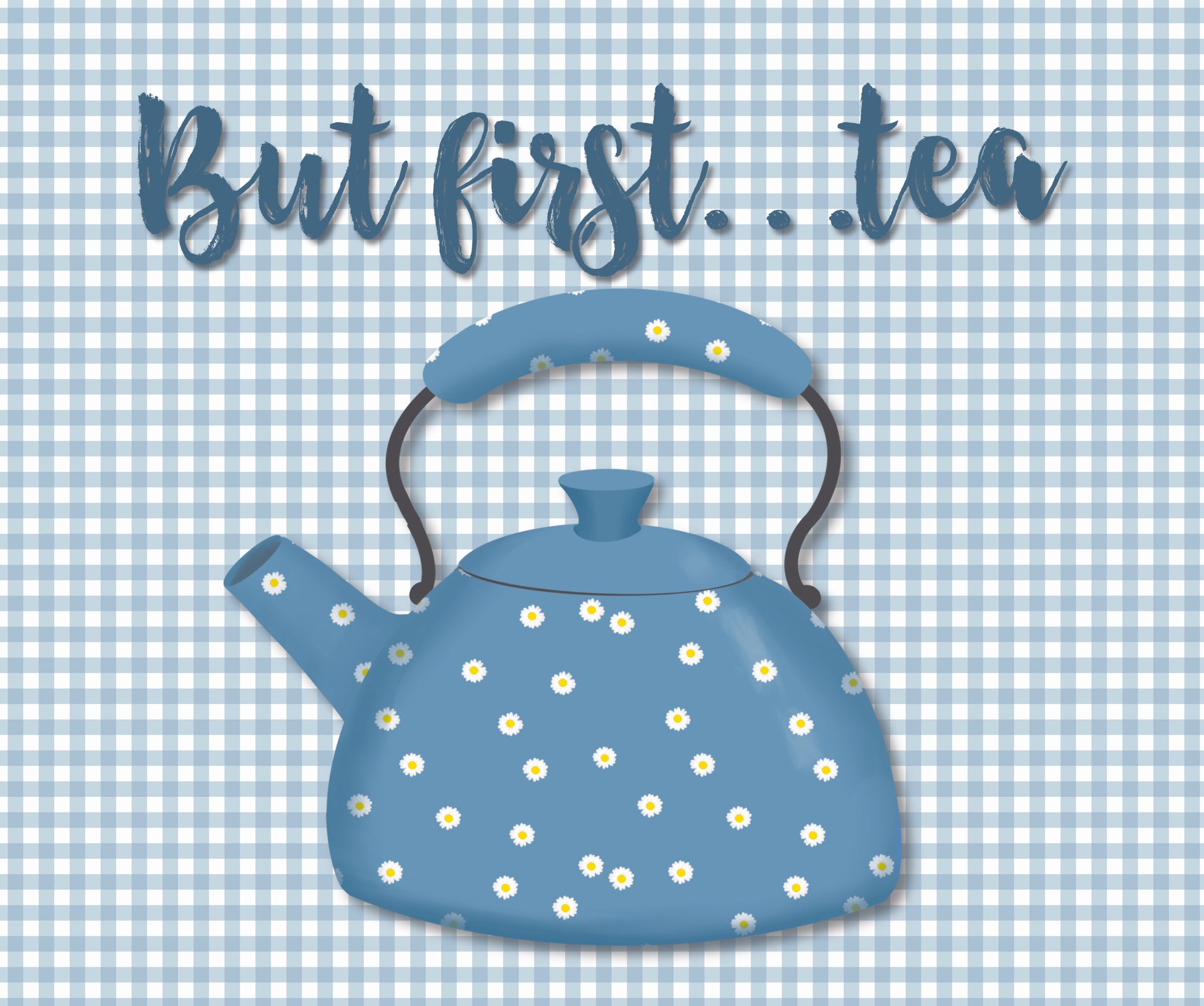 Perfect for a tea lover’s kitchen: a cheerful illustration of a daisy-patterned kettle on a blue gingham background with the motto “but first…tea”.