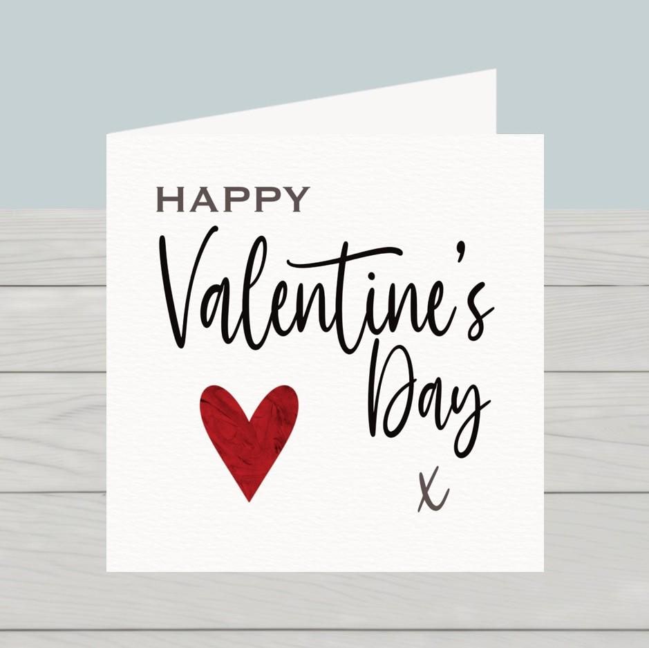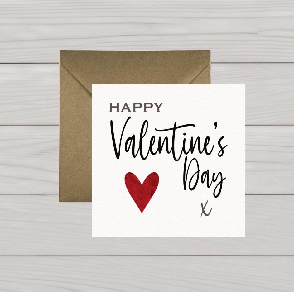 This classic Valentine's card design features a heart and the message "Happy Valentine's Day". It is an original Blue Trousers design, which is printed in the UK on high quality, sustainably sourced 324gsm card. This Valentine's card measures 5.5 by 5.5 inches (14cm by 14cm), is supplied with a brown recycled kraft paper envelope, and comes safely packaged in a biodegradable plastic wrapper. This card is blank on the inside, for you to write your own message.