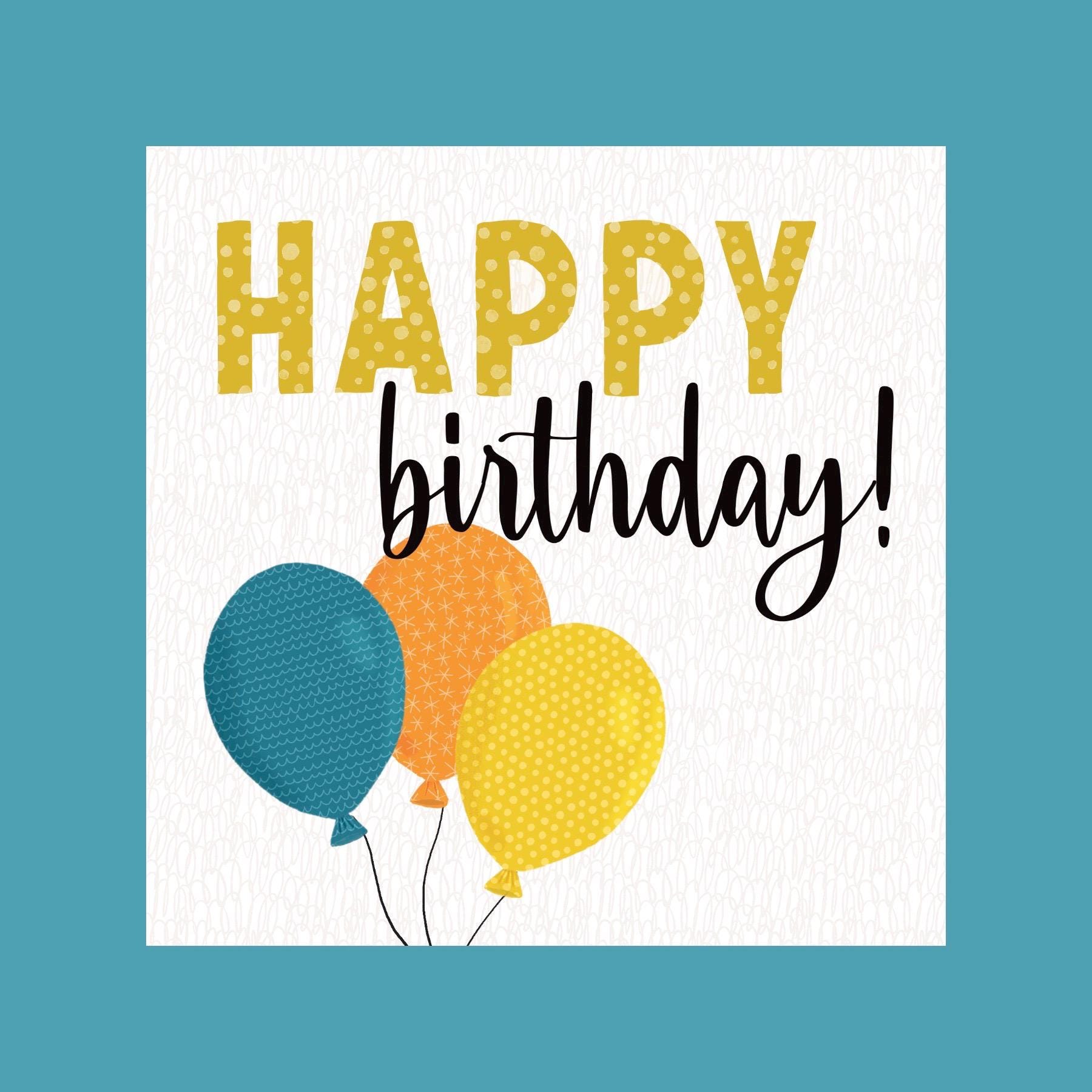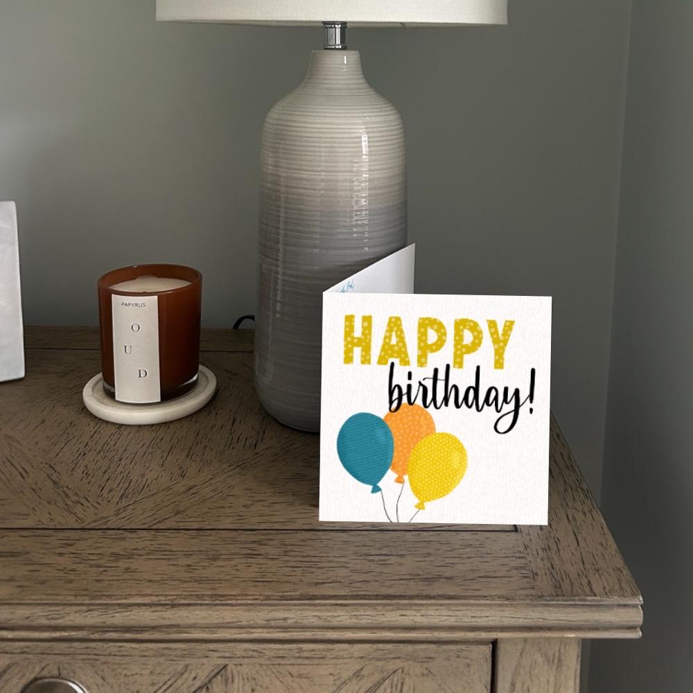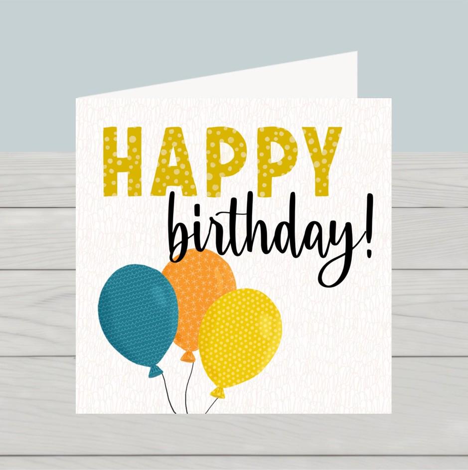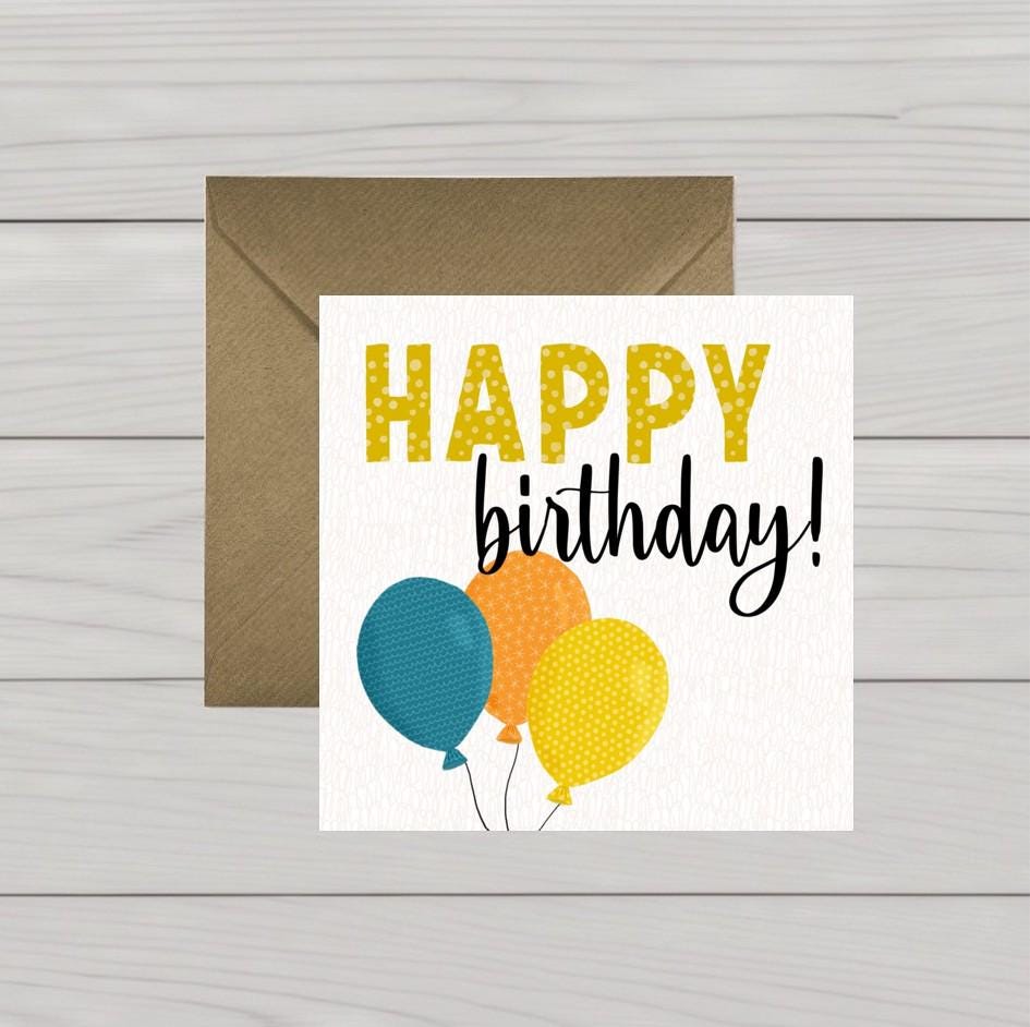 This elegant Birthday card features three colourful balloons, and is ideal for family and friends of all ages. It is an original Blue Trousers design, which is printed in the UK on high quality, sustainably sourced 324gsm card. This birthday card measures 5.5 by 5.5 inches (14cm by 14cm), is supplied with a brown recycled kraft paper envelope, and comes safely packaged in a biodegradable plastic wrapper. This card is blank on the inside, for you to write your own message.