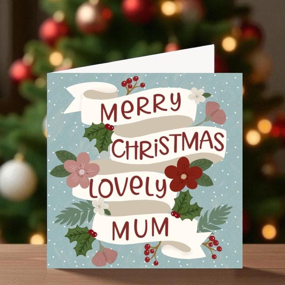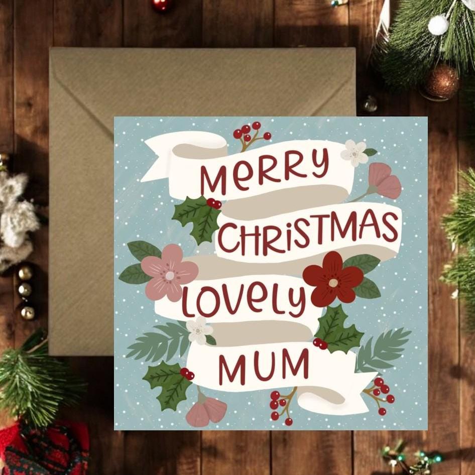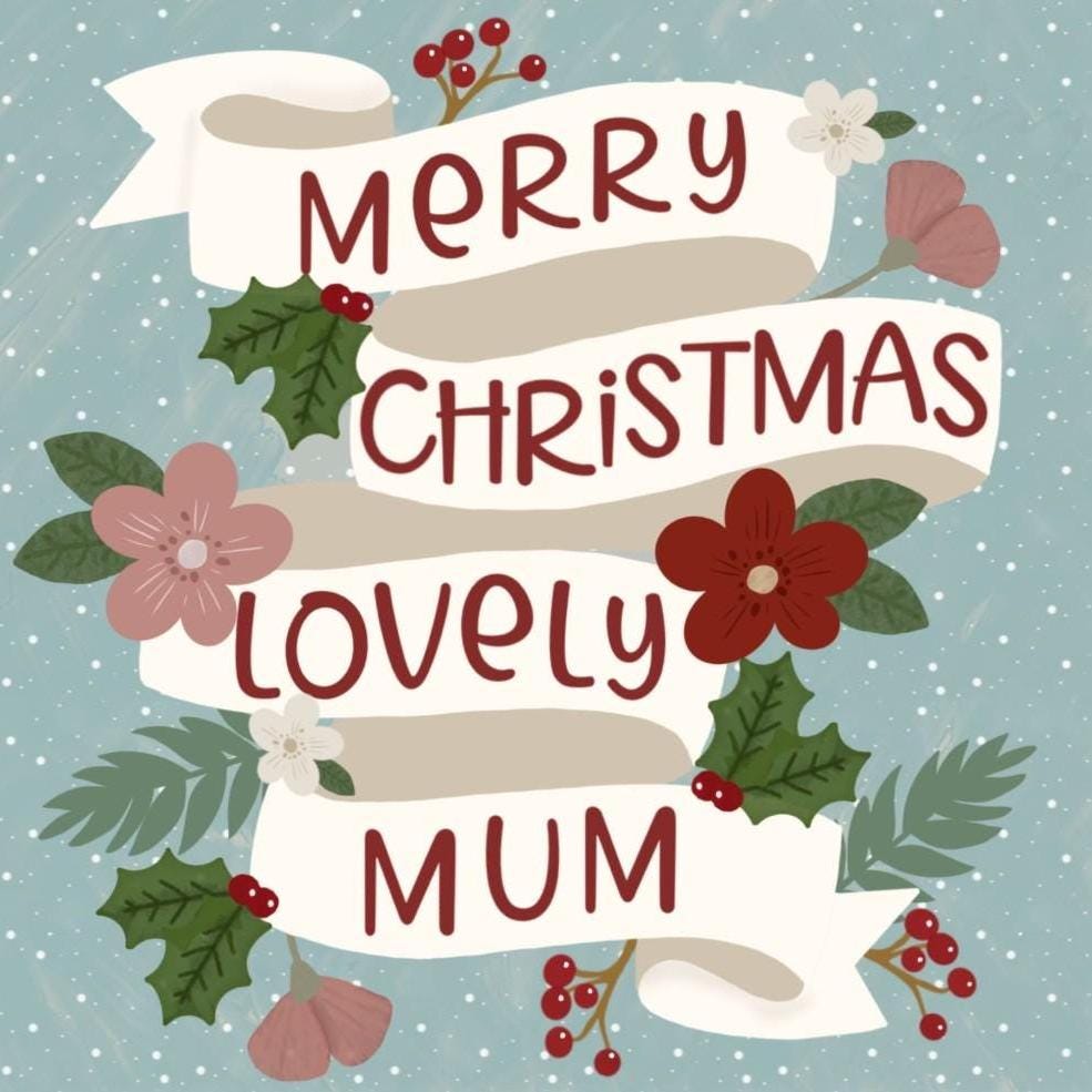This classic Christmas card features a floral banner and is perfect wishing a merry Christmas to a lovely Mum. It is an original Blue Trousers design, which is printed in the UK on high quality, sustainably sourced 324gsm card. This Christmas card measures 5.5 by 5.5 inches (14cm by 14cm), is supplied with a brown recycled kraft paper envelope, and comes safely packaged in a biodegradable plastic wrapper. Printed on the inside of the card is the message "Merry Christmas".