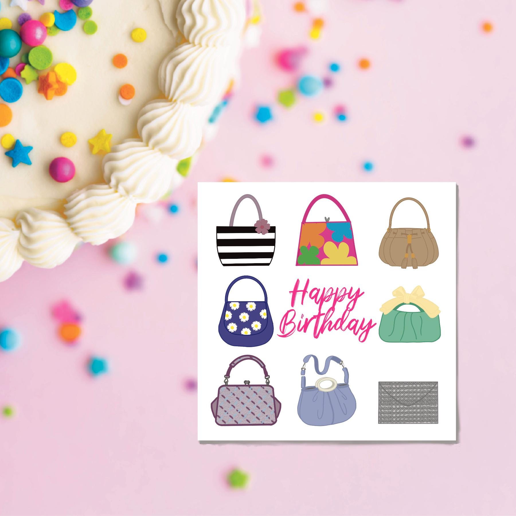 This colourful Happy Birthday card features a selection of handbags, and is ideal for women of all ages.