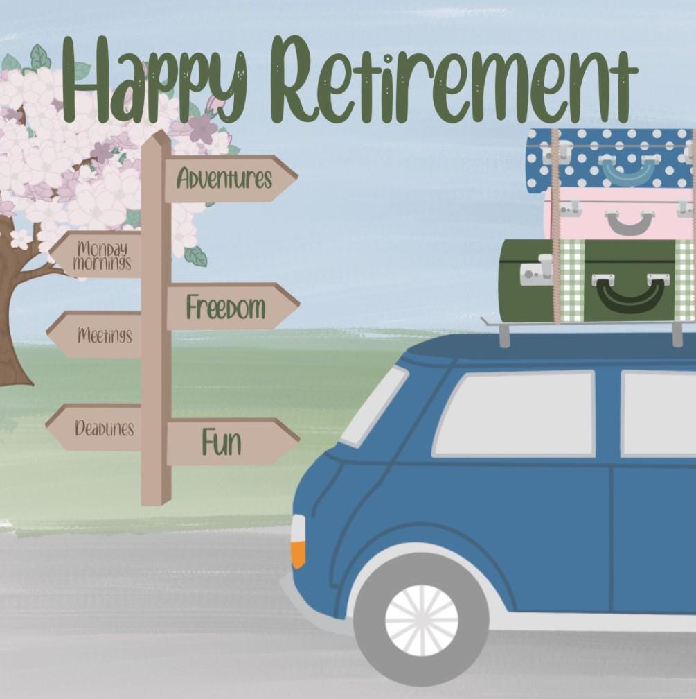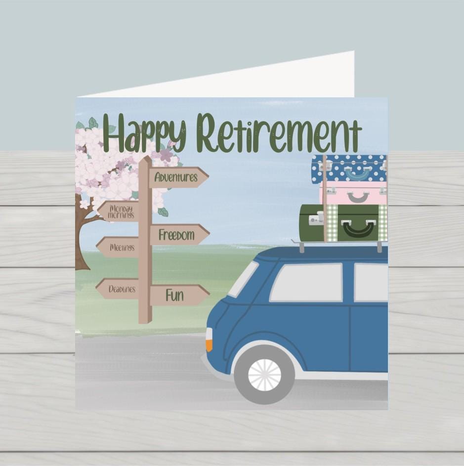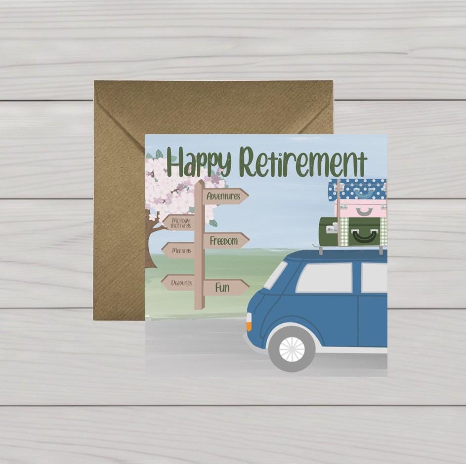 This classic Retirement card features a car loaded with luggage setting off on an adventure filled with freedom and fun. It is an original Blue Trousers design, which is printed in the UK on high quality, sustainably sourced 324gsm card. This retirement card measures 5.5 by 5.5 inches (14cm by 14cm), is supplied with a brown recycled kraft paper envelope, and comes safely packaged in a biodegradable plastic wrapper. It is blank on the inside, for you to write your own message.