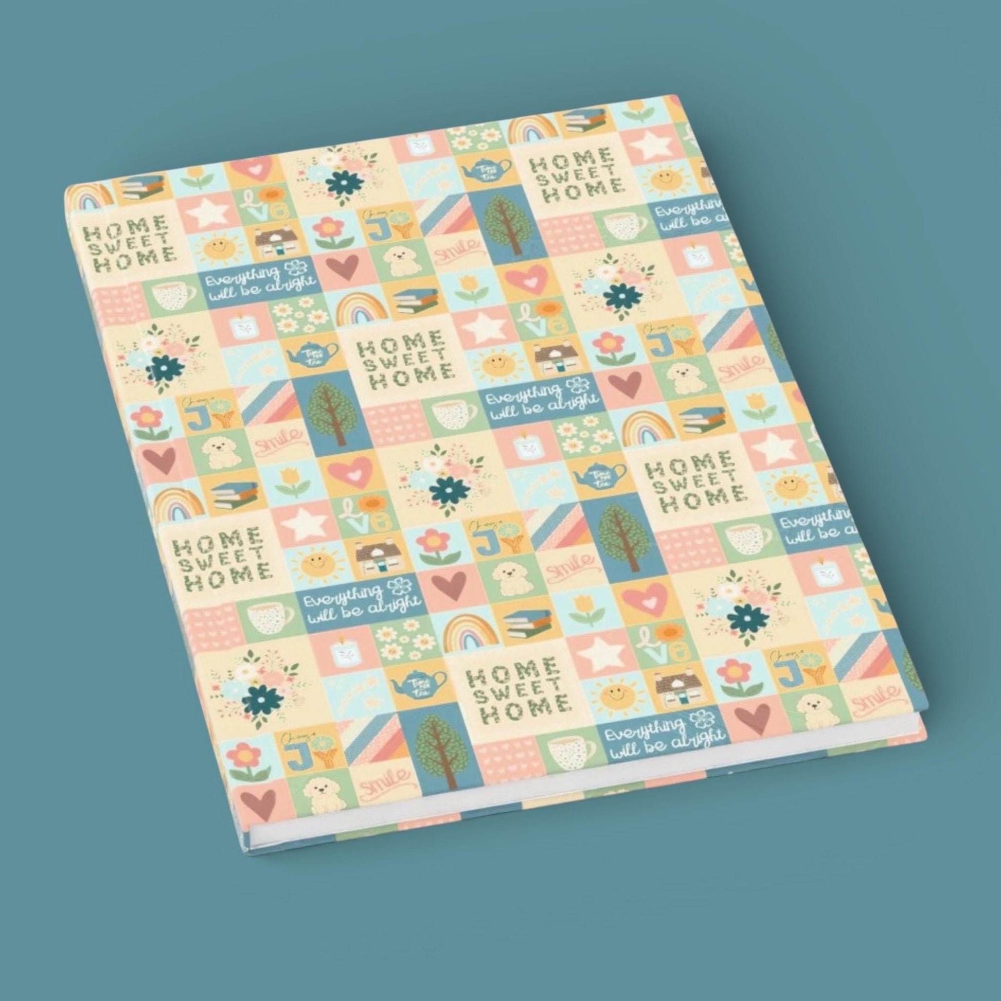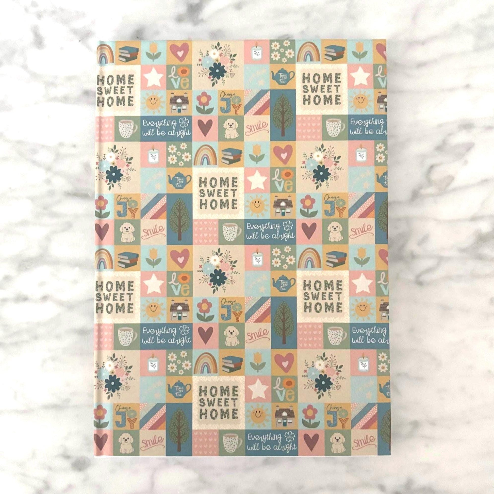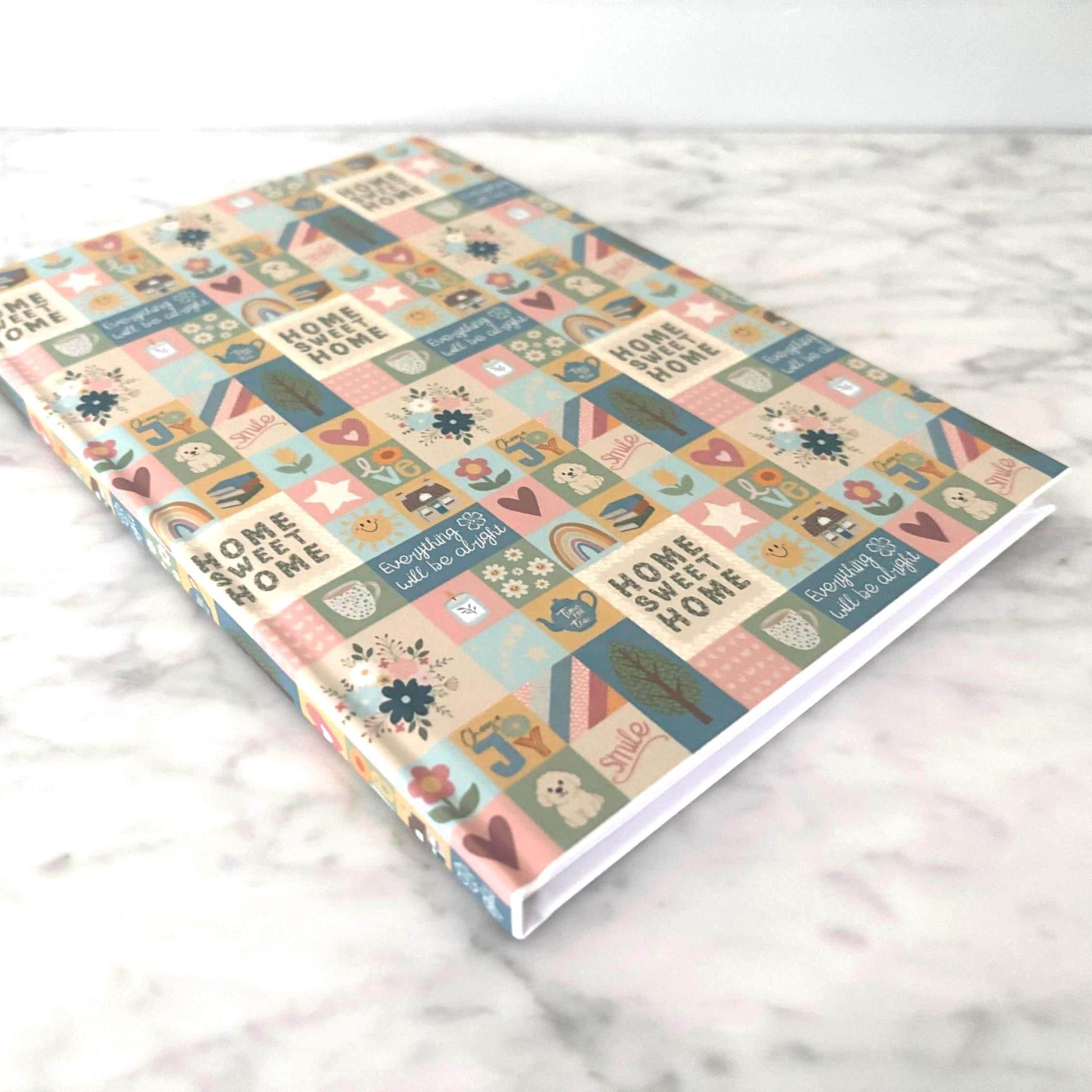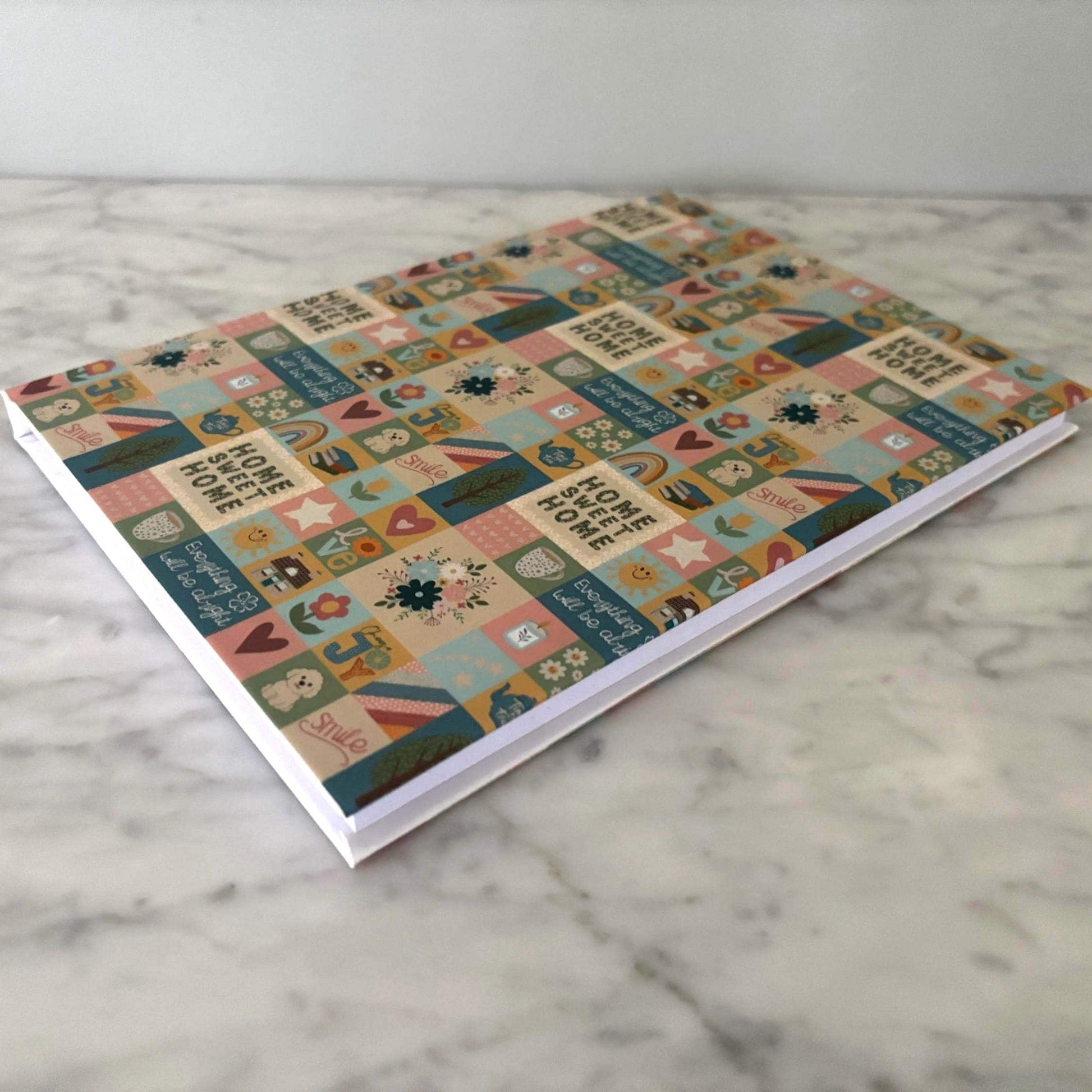 This high quality A5 notebook has a durable laminated hard cover with our unique Home Sweet Home patchwork design. It has 128 pages made with 90gsm white paper, each of which is ruled with lines making it perfect for making notes, writing lists, or using as a journal. It is A5 size, measuring 14.8 by 21cm, and has been designed and printed in the UK using high quality sustainably sourced paper.