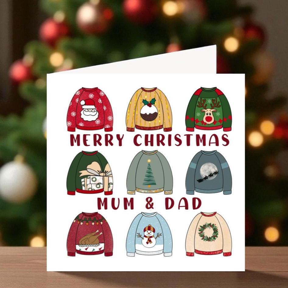 This classic Christmas card features colourful Christmas jumpers and is perfect wishing a Merry Christmas to Mum and Dad. It is an original Blue Trousers design, which is printed in the UK on high quality, sustainably sourced 324gsm card. This Christmas card measures 5.5 by 5.5 inches (14cm by 14cm), is supplied with a brown recycled kraft paper envelope, and comes safely packaged in a biodegradable plastic wrapper. Printed on the inside of the card is the message "Merry Christmas".