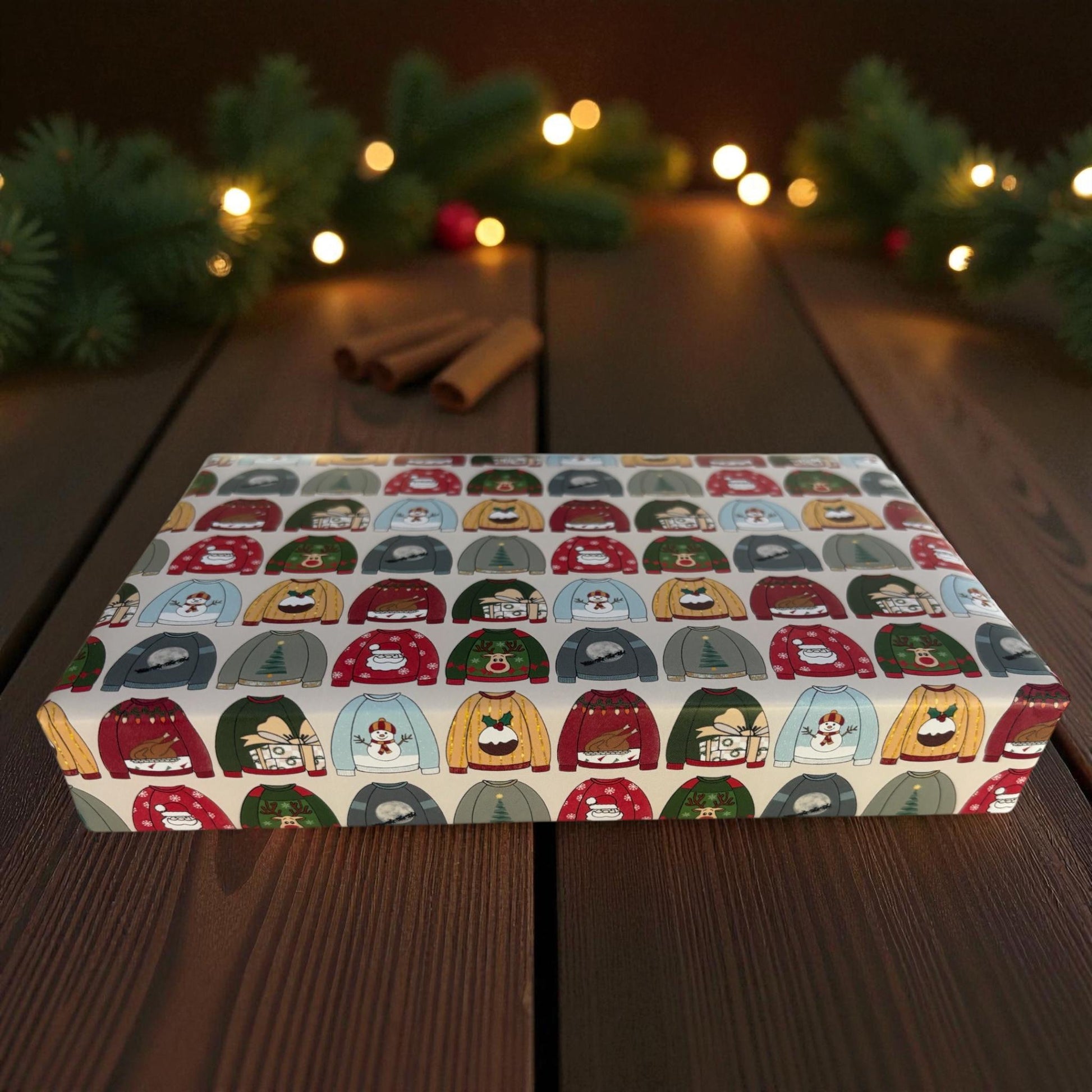 A fun design featuring different colourful christmas jumpers in a repeating pattern, this luxury Christmas wrapping paper is perfect for all ages - children, teens and adults. Made to our original design, it is printed on high quality 135gsm sustainably sourced paper. It is supplied in 50cm by 70cm sheets which are easy to cut and fold, and is sent out in cardboard tubes so it arrives flat and in perfect condition.