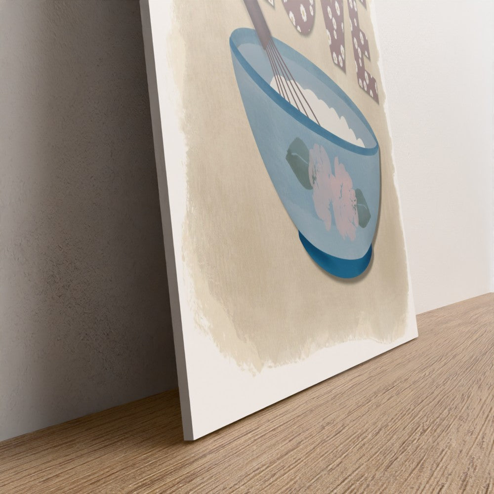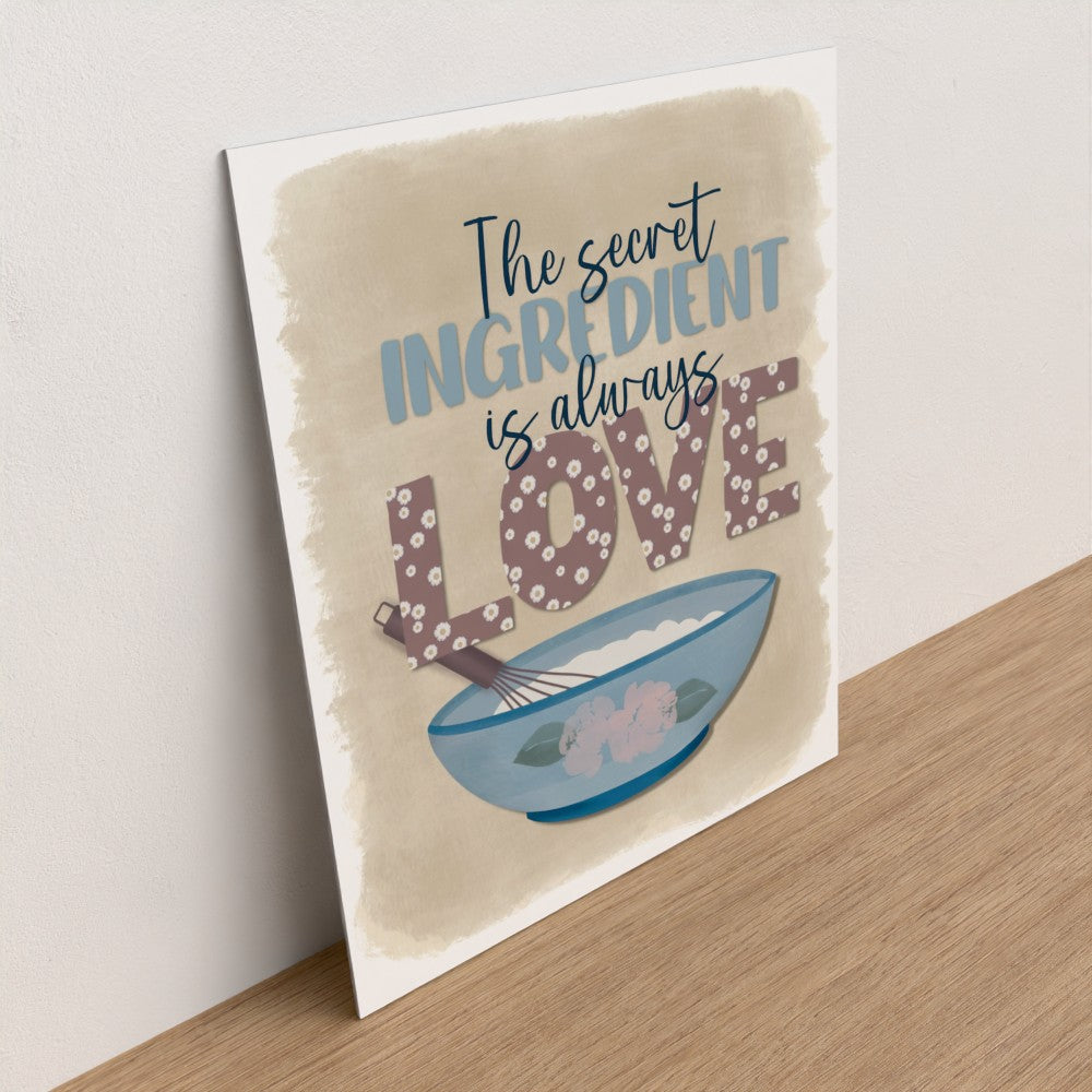 Charming elegant hand-drawn design featuring "The secret ingredient is always love" headline above a mixing bowl and whisk, printed on textured watercolour art board.
