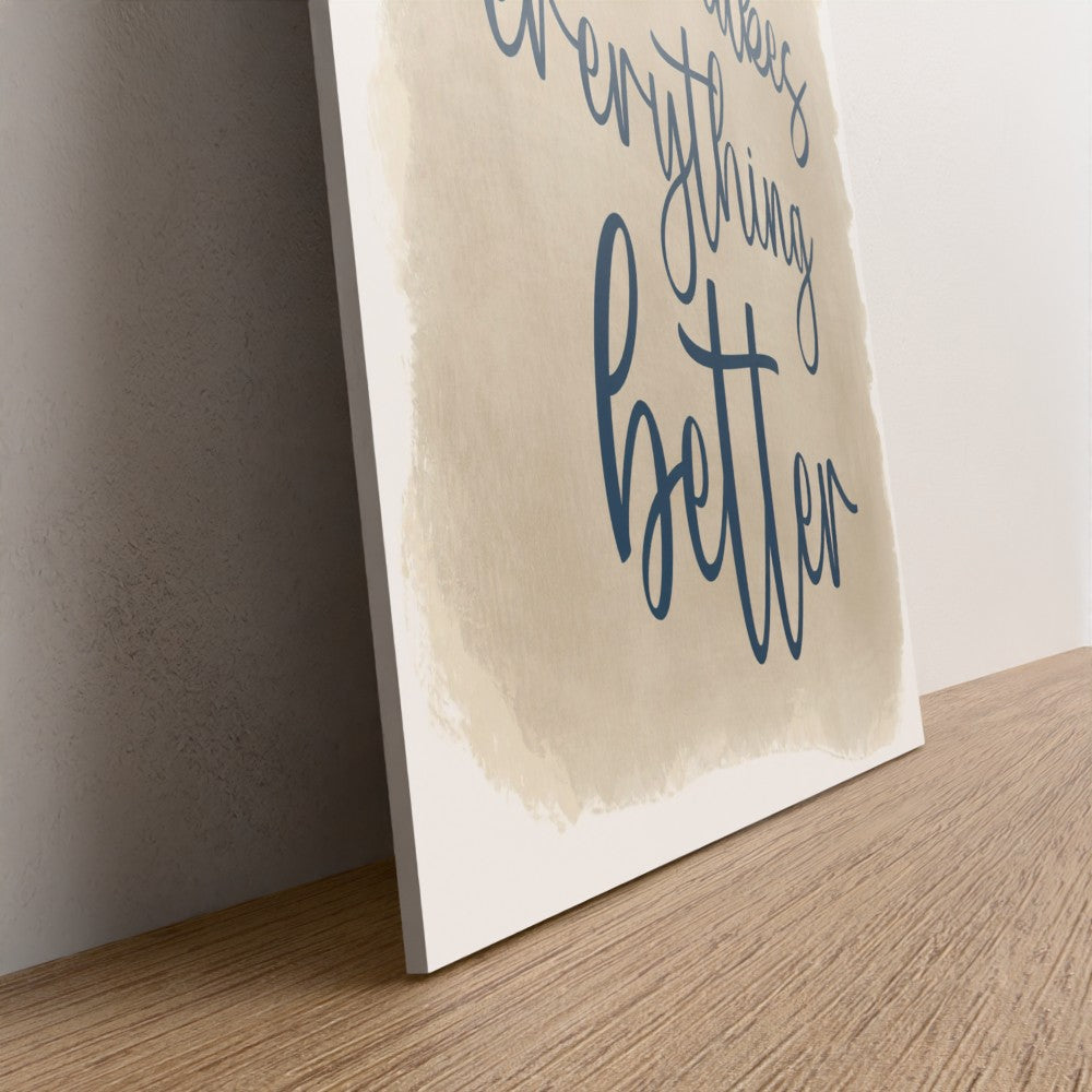 Charming elegant hand-drawn design featuring the text "Tea makes everything better" below some tea served in an elegant blue cup, printed on textured watercolour art board.