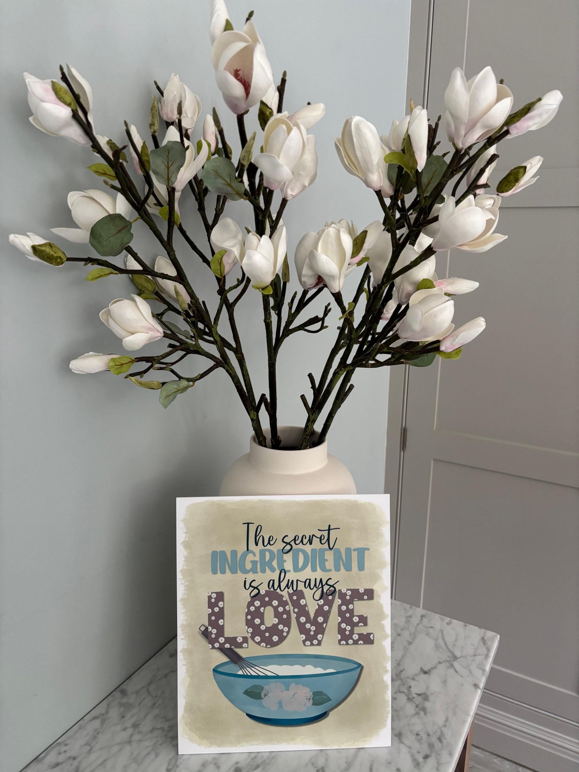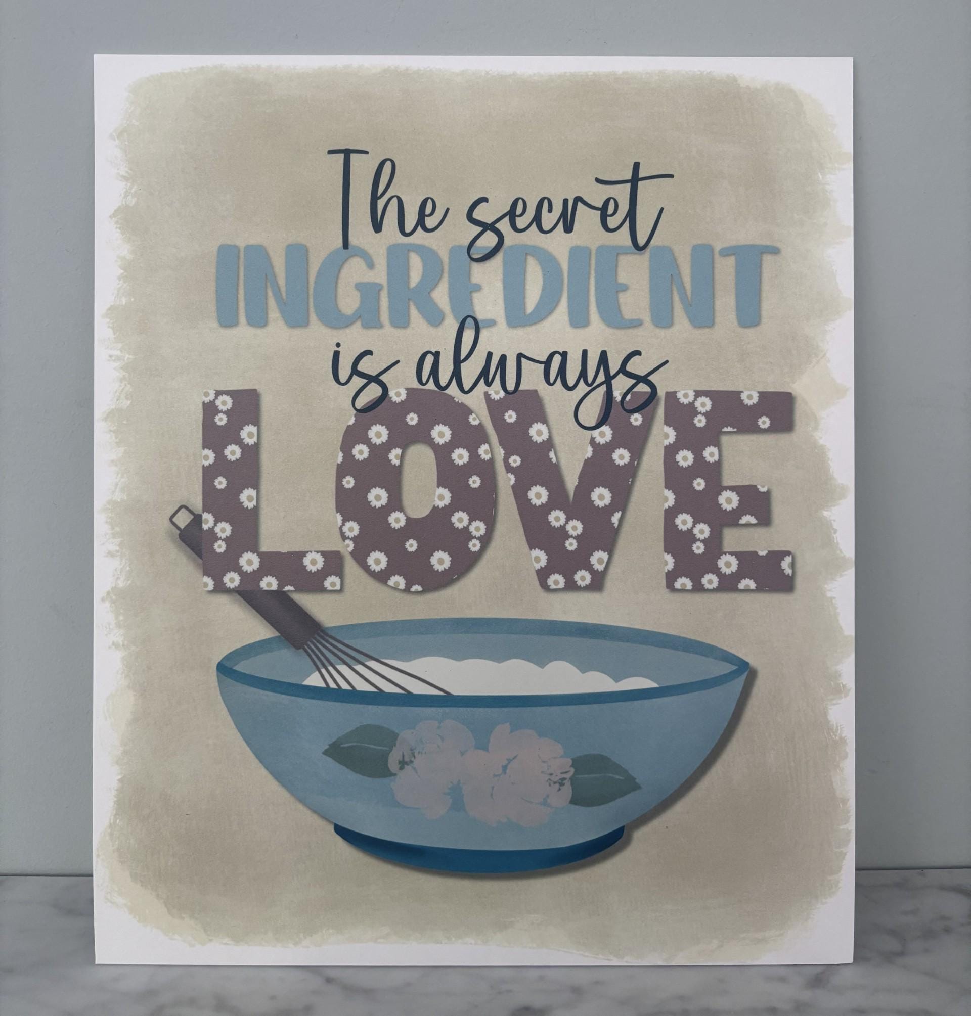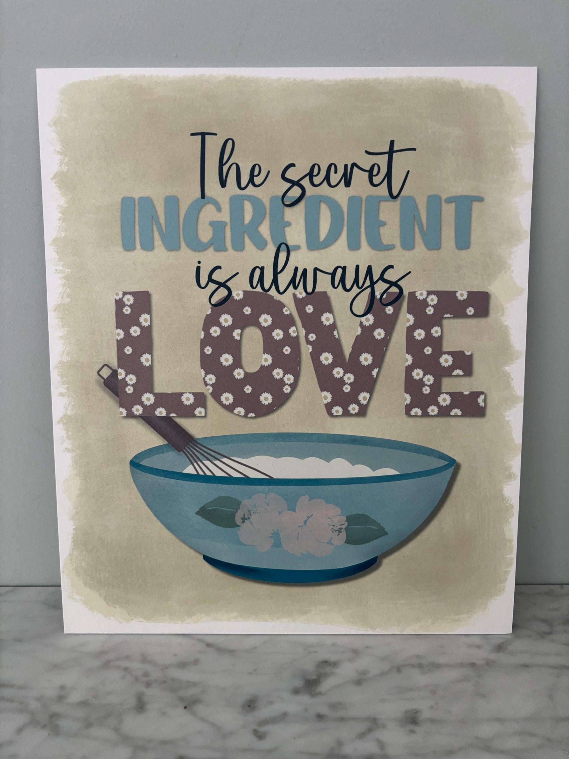 Charming elegant hand-drawn design featuring "The secret ingredient is always love" headline above a mixing bowl and whisk, printed on textured watercolour art board.