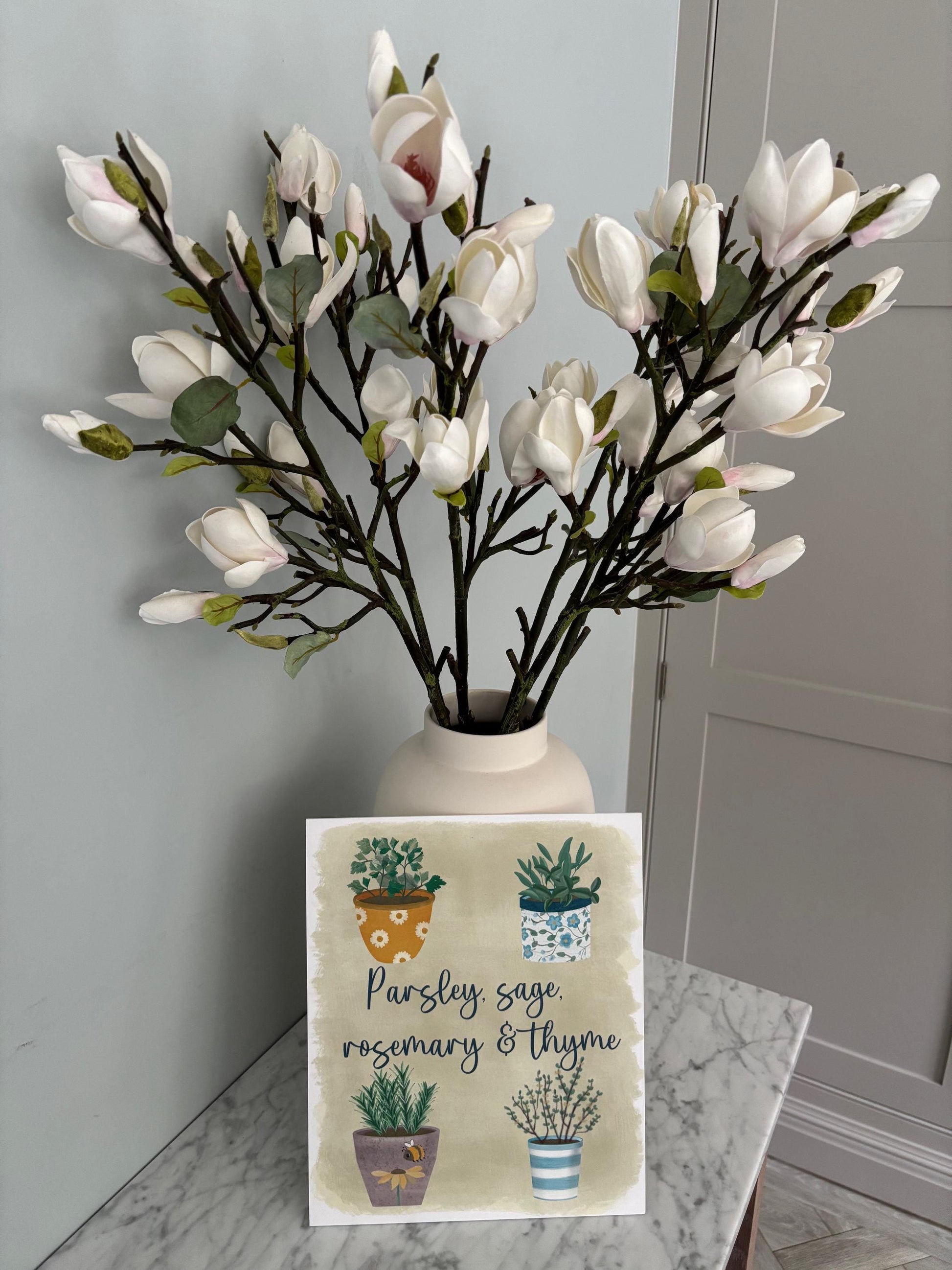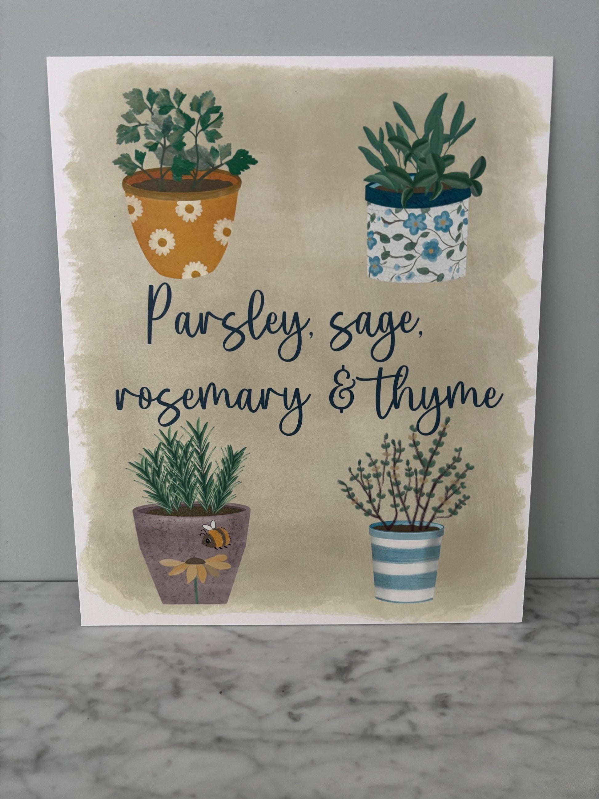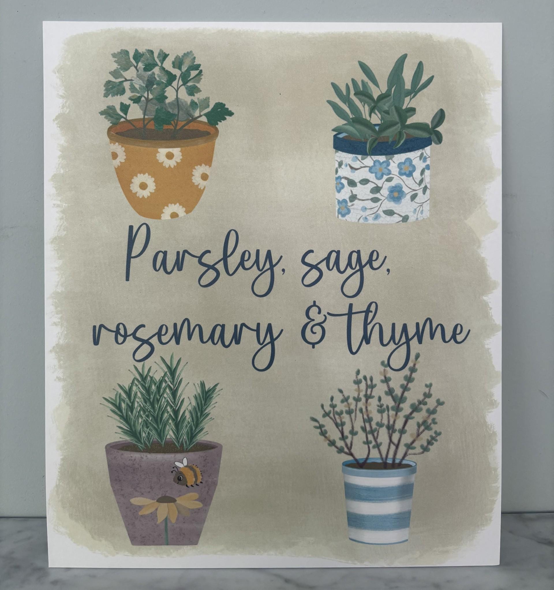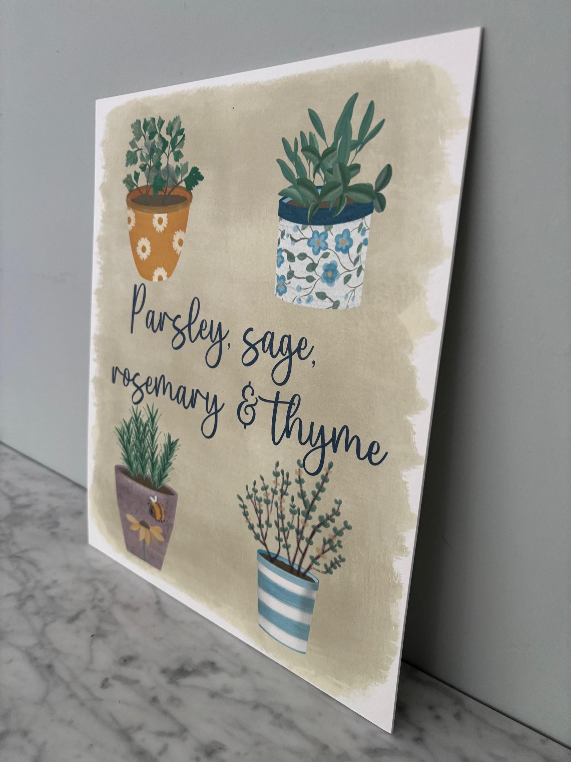 Charming elegant hand-drawn design featuring "Parsley sage rosemary & thyme" writing together with small pots containing each of these four herbs, printed on textured watercolour art board.