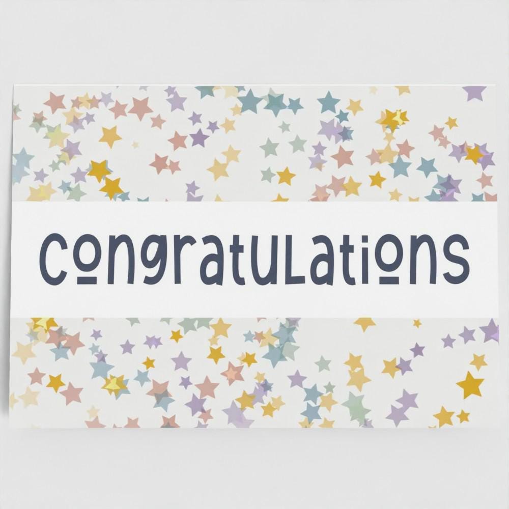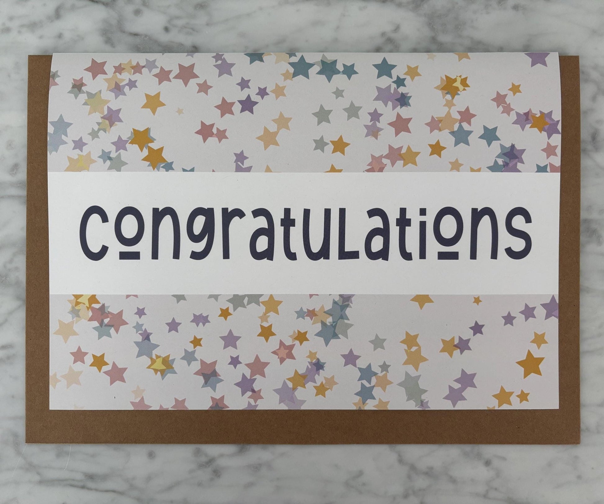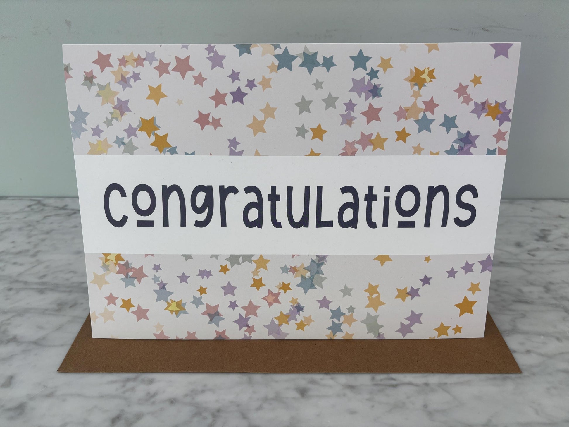 This large Congratulations card features multi-coloured stars. It is an original Blue Trousers design, which is printed in the UK on high quality, sustainably sourced 324gsm card. This Congratulations card is A4 in size measuring 29.7cm by 21cm, and is blank on the inside so there is plenty of room for everyone to write their own message. It is supplied with a brown recycled kraft paper envelope, and comes safely packaged in a biodegradable plastic wrapper.