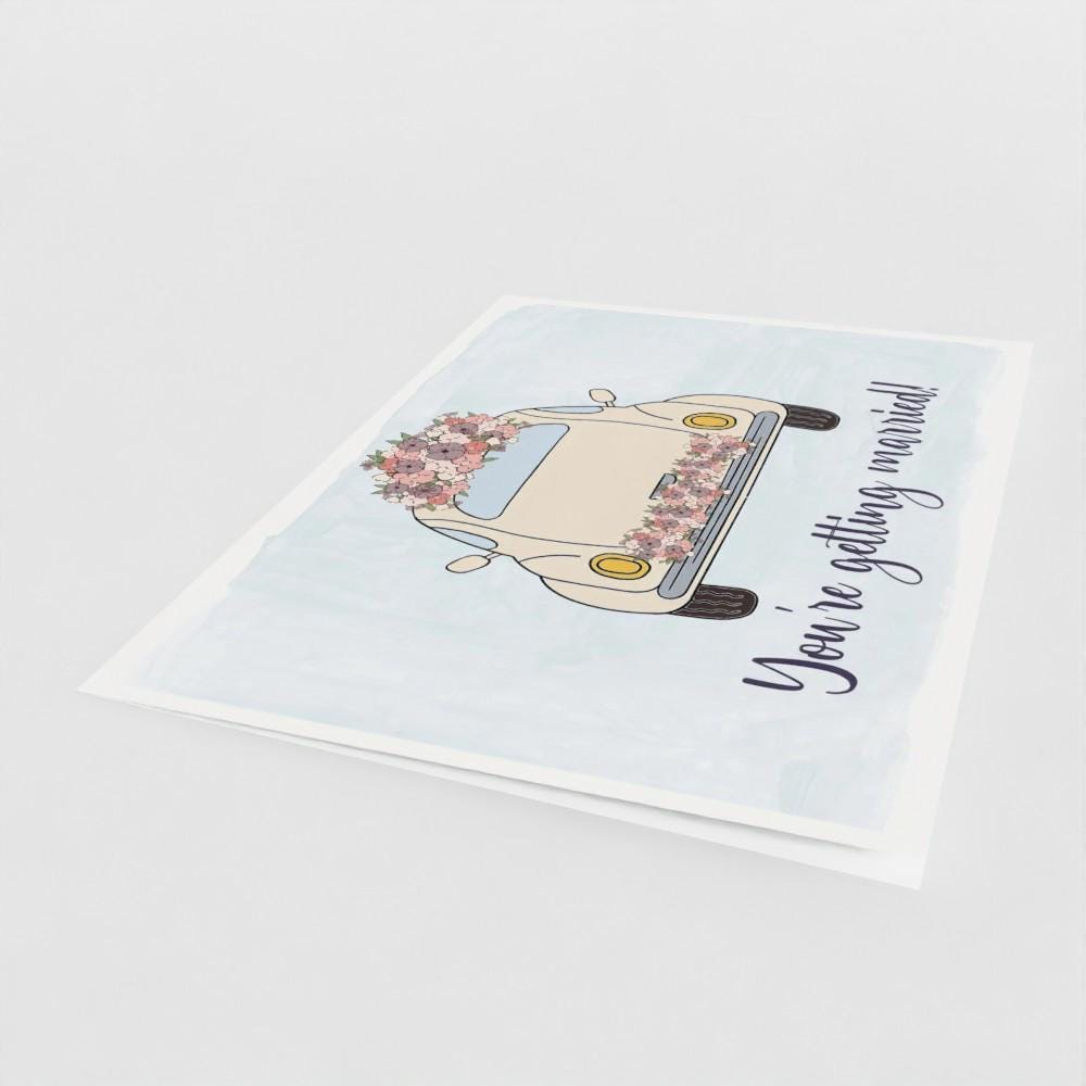 This large Wedding card features a classic going away car decorated with flowers. It is an original Blue Trousers design, which is printed in the UK on high quality, sustainably sourced 324gsm card. This Getting Married card is A4 in size measuring 29.7cm by 21cm, and is blank on the inside so there is plenty of room for everyone to write their own message. It is supplied with a brown recycled kraft paper envelope, and comes safely packaged in a biodegradable plastic wrapper.