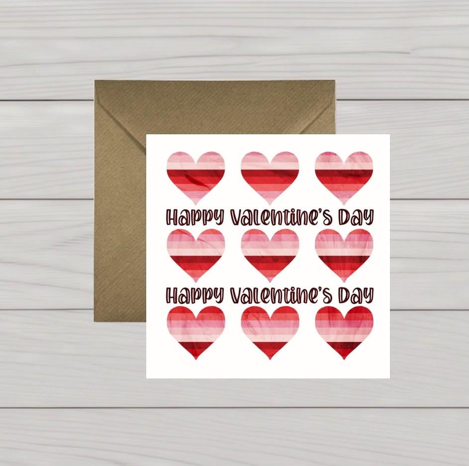 This classic Valentine's card design features love hearts and the message "Happy Valentine's Day". It is an original Blue Trousers design, which is printed in the UK on high quality, sustainably sourced 324gsm card. This Valentine's card measures 5.5 by 5.5 inches (14cm by 14cm), is supplied with a brown recycled kraft paper envelope, and comes safely packaged in a biodegradable plastic wrapper. This card is blank on the inside, for you to write your own message.