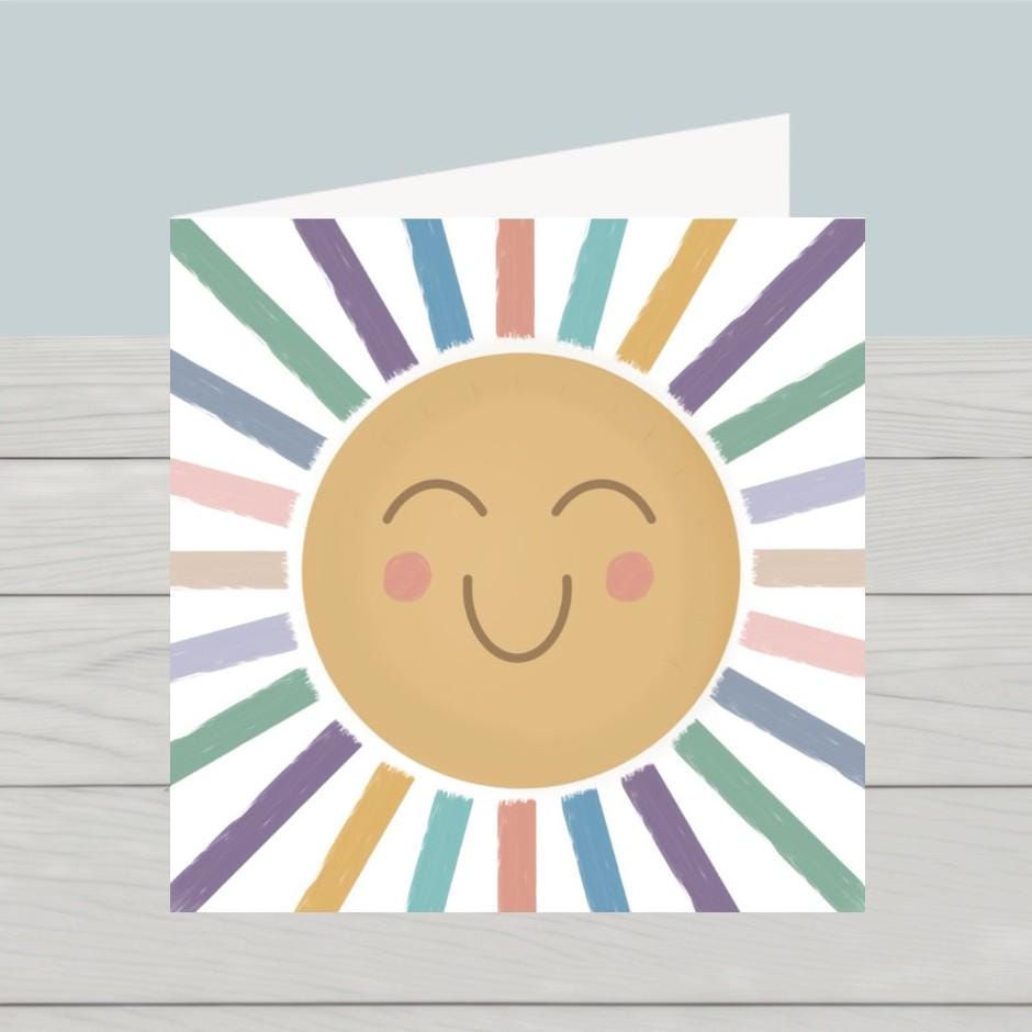 This classic note card features a smiling sunshine with multicoloured rays, and is perfect for sending a quick note to a friend or loved one. It is an original Blue Trousers design, which is printed in the UK on high quality, sustainably sourced 324gsm card. This note card measures 5.5 by 5.5 inches (14cm by 14cm), is supplied with a brown recycled kraft paper envelope, and comes safely packaged in a biodegradable plastic wrapper. This card is blank on the inside, for you to write your own message.