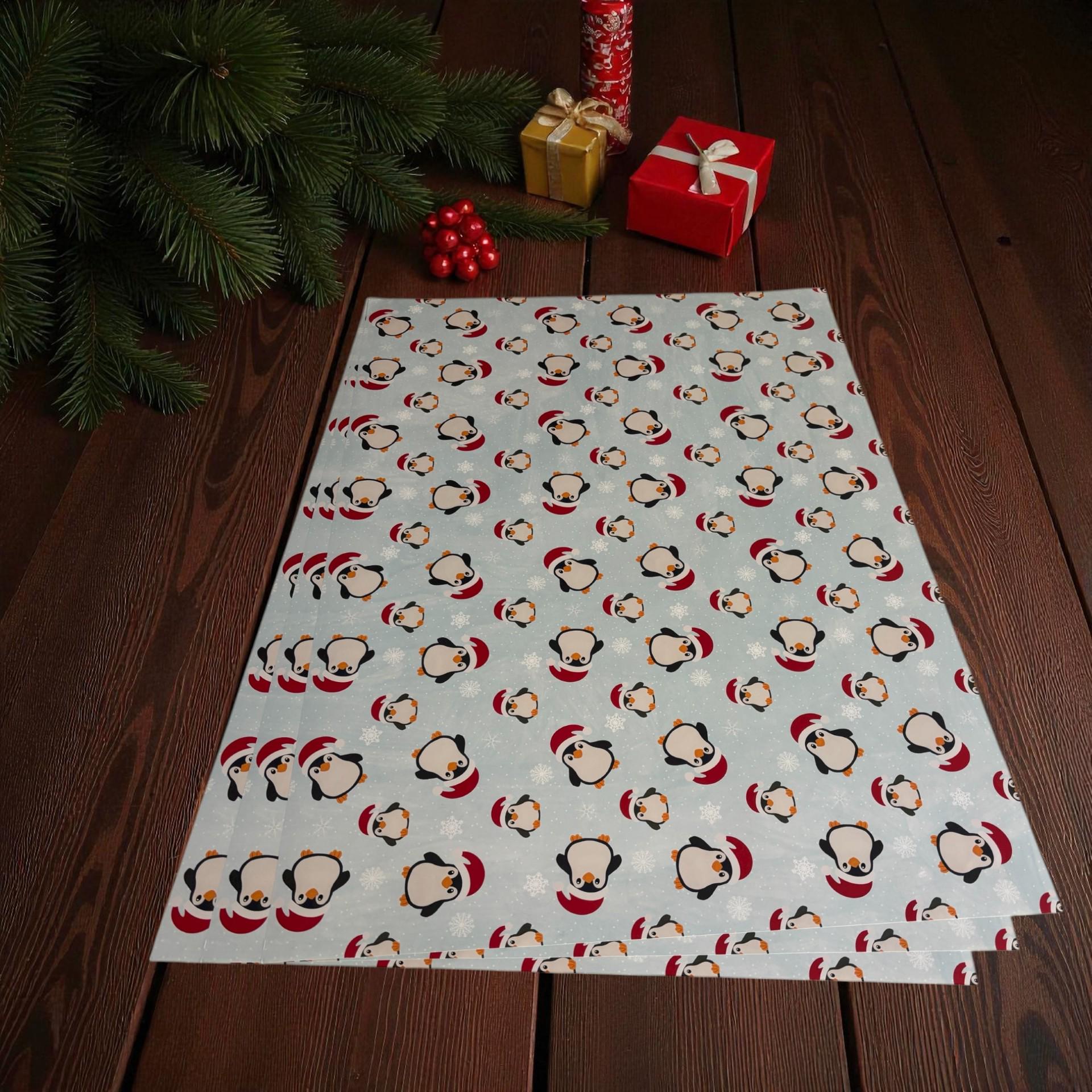 A classic design featuring cute penguins with red hats on a pale blue background with snowflakes, this luxury Christmas wrapping paper is ideal for family and friends of all ages. Made to our original design, it is printed on high quality 135gsm sustainably sourced paper. It is supplied in 50cm by 70cm sheets which are easy to cut and fold, and is sent out in cardboard tubes so it arrives flat and in perfect condition.
