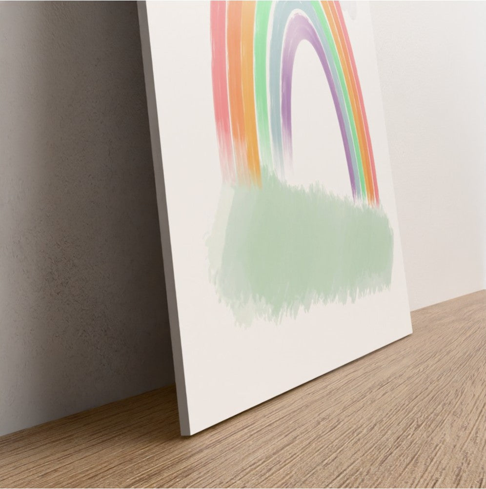 A hot air balloon sailing over a rainbow. In muted retro-style rainbow colours on a neutral background, perfects for adults or children.