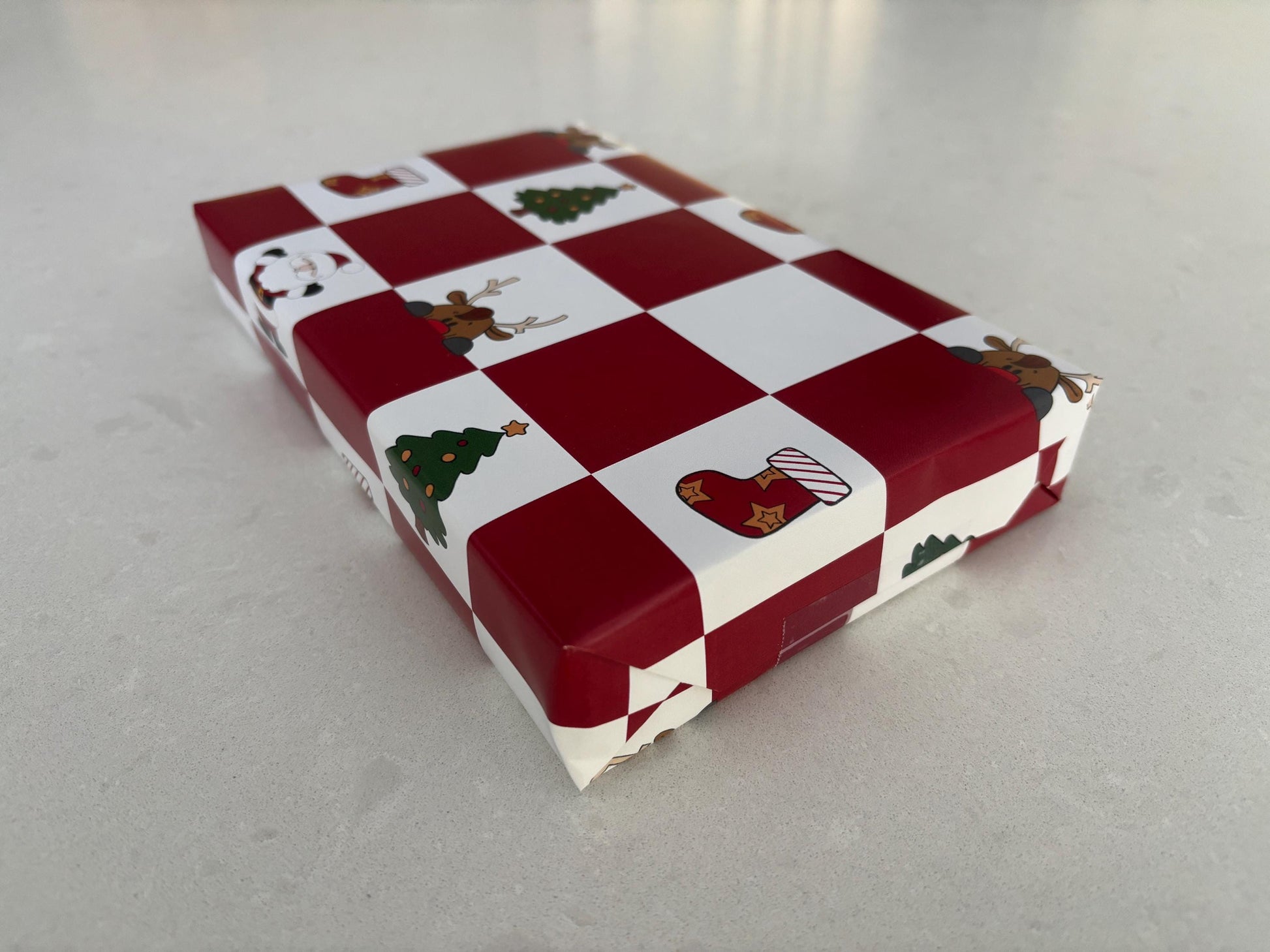 A classic design featuring Santa and other Christmas icons on a red checkerboard background, this luxury Christmas wrapping paper is ideal for family and friends of all ages. Made to our original design, it is printed on high quality 135gsm sustainably sourced paper. It is supplied in 50cm by 70cm sheets which are easy to cut and fold, and is sent out in cardboard tubes so it arrives flat and in perfect condition.