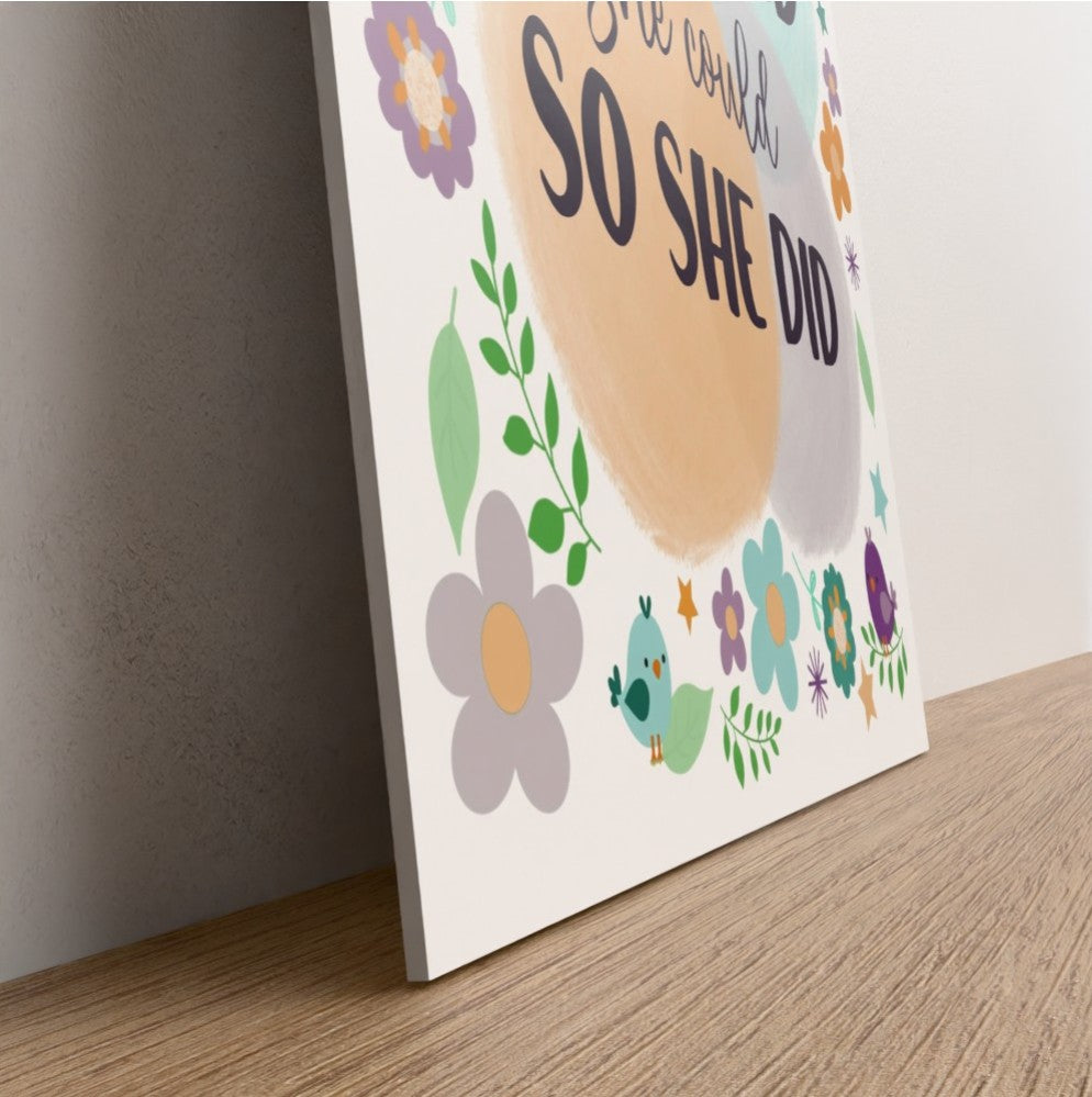 Motivational wall art: colourful birds and flowers background with the motto “she believed she could so she did”.