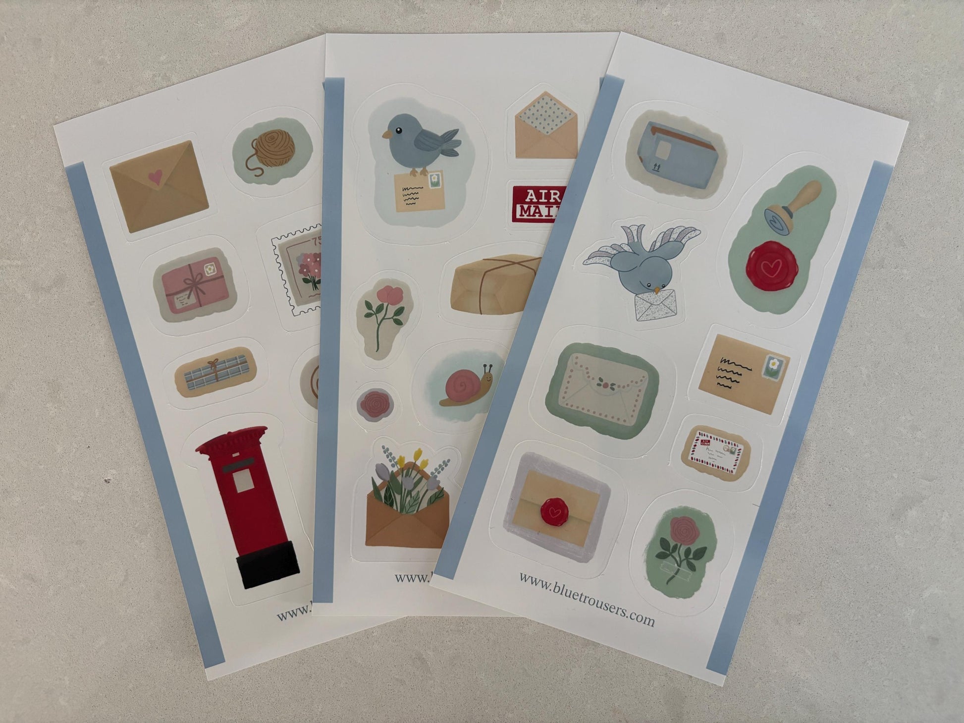 Twenty six vinyl stickers featuring a variety of letter and parcel themed images, designed and printed by us here in the UK. Each colour sticker is a different original design, and comes kiss cut following the outline of image. The stickers are supplied on three sheets, and are easy to peel and have a long-lasting glue that works well on any smooth surfaces including paper, card, wood, laptops, phone cases, journals, scrapbooks, and water bottles. The vinyl material is durable and water resistant, and the sticker sizes range in size from 1.6cm by 1.6cm for the flower to 6.1cm by 2.8cm for the postbox. Each sheet measures 4” x 7” (approximately 10cm x 18cm).