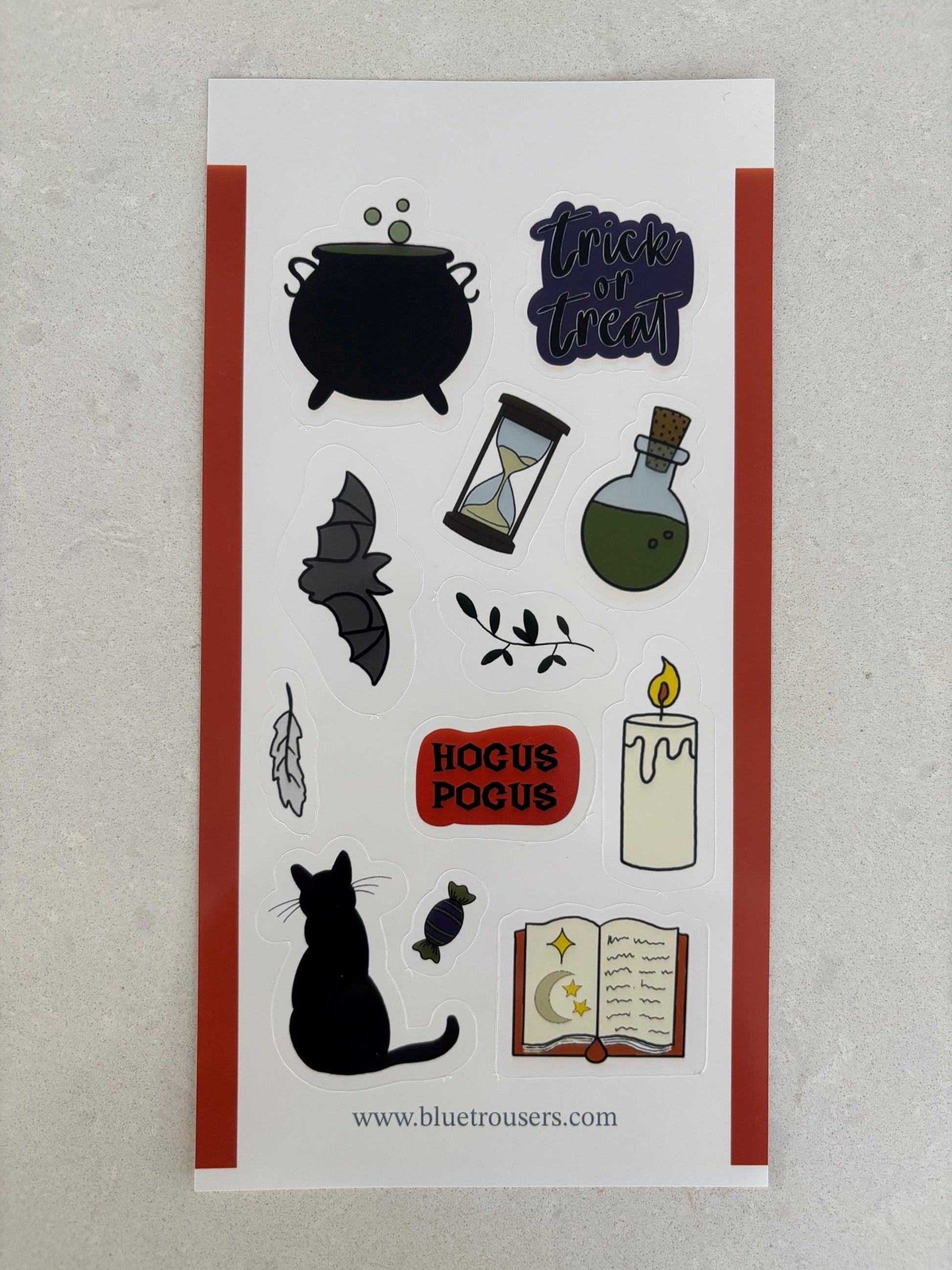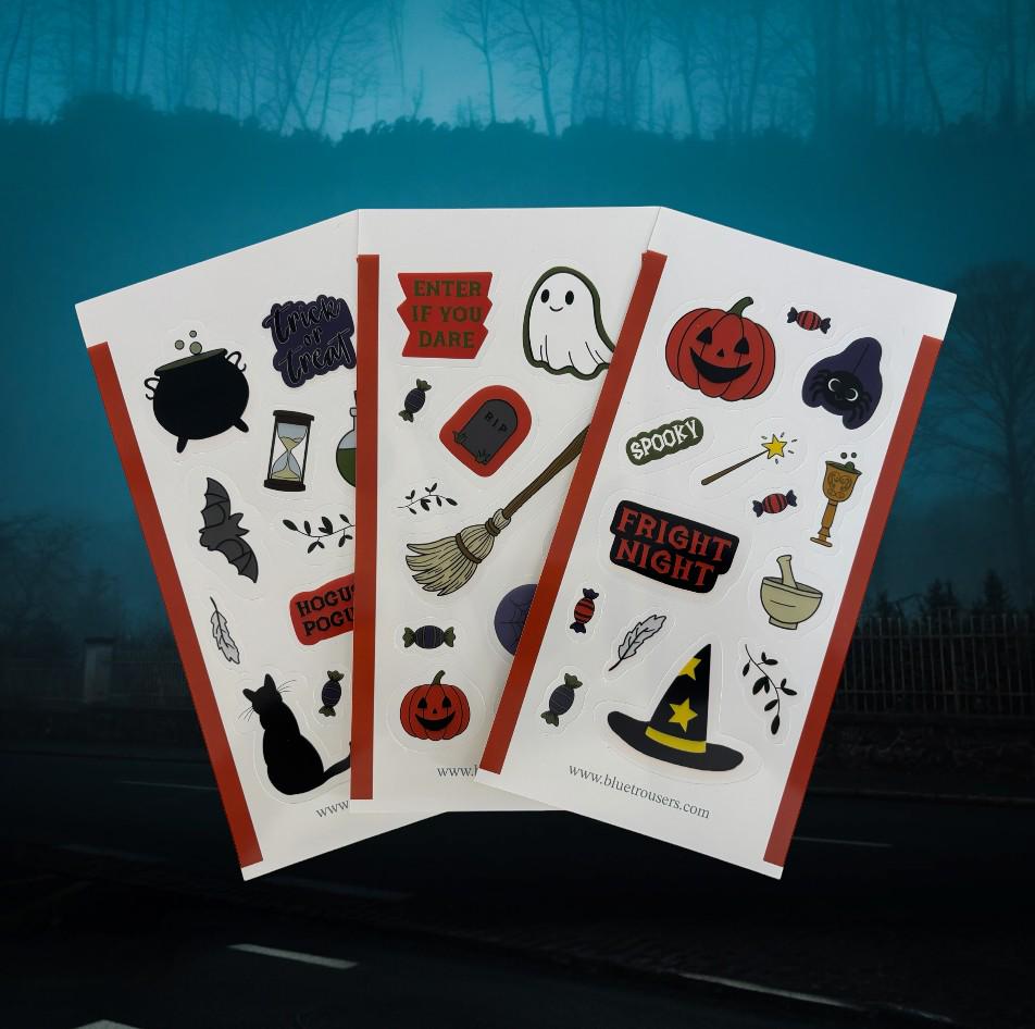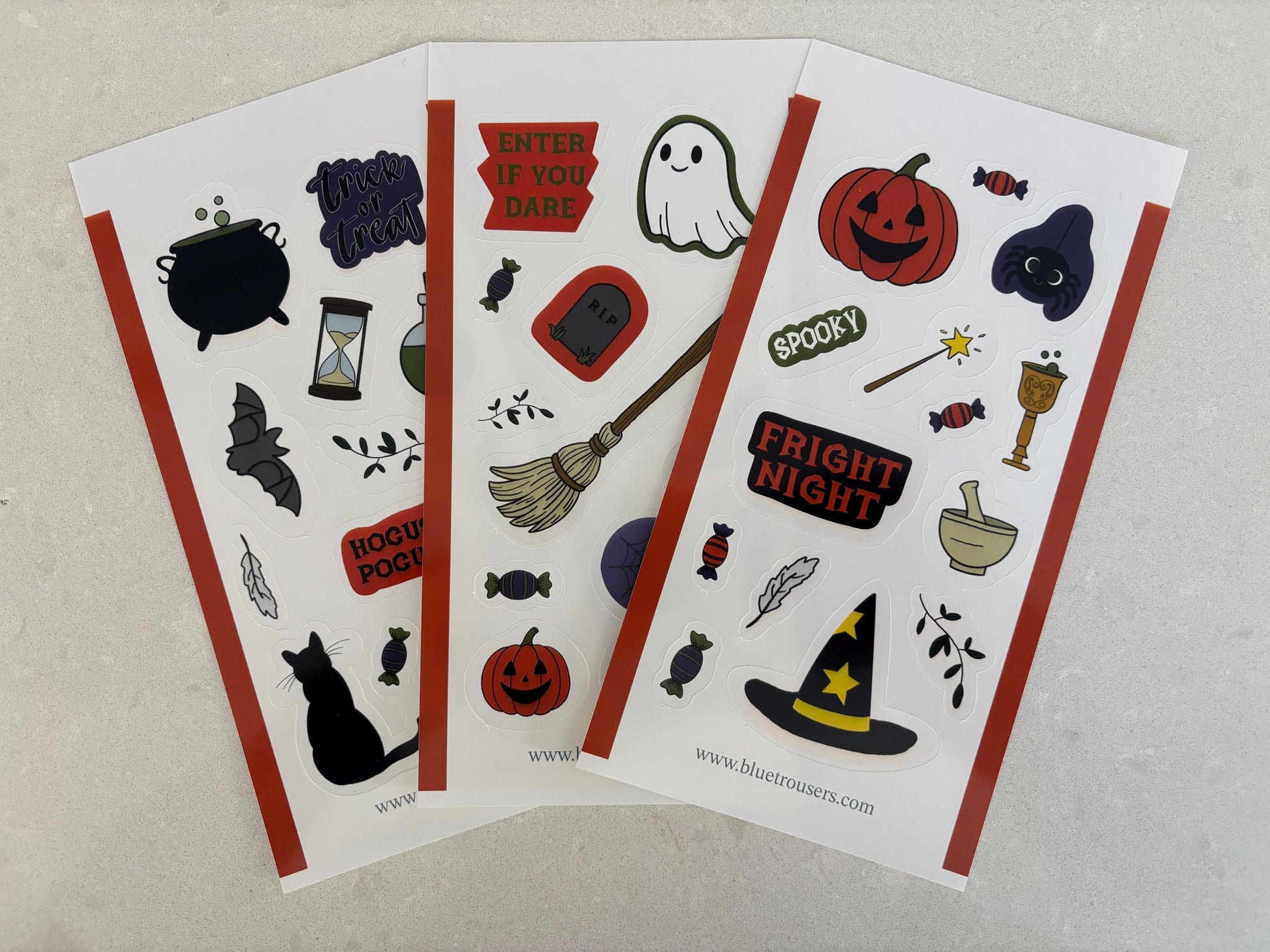 Thirty eight spooky vinyl stickers featuring a variety of Halloween themed objects and messages, designed and printed by us here in the UK. Each colour sticker is a different original design, and comes kiss cut following the outline of image. The stickers are supplied on three sheets, and are easy to peel and have a long-lasting glue that works well on any smooth surfaces including paper, card, wood, laptops, phone cases, journals, scrapbooks, and water bottles. The vinyl material is durable and water resistant, and the sticker sizes range in size from 1.9cm by 1.1cm for a sweet to 9.0cm by 2.9cm for the broomstick. Each sheet measures 4” x 7” (approximately 10cm x 18cm).