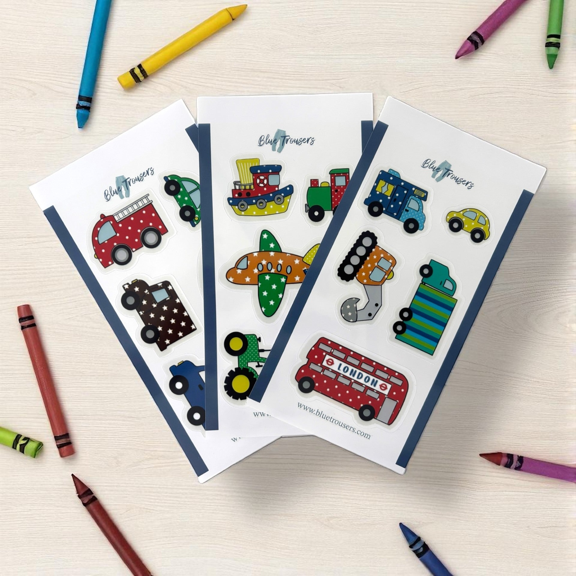Sixteen colourful vinyl stickers featuring a variety of vehicles, designed and printed by us here in the UK. Each colour sticker is a different original design, and comes kiss cut following the outline of the vehicle. The stickers are supplied on three sheets, and are easy to peel and have a long-lasting glue that works well on any smooth surfaces including paper, card, wood, laptops, phone cases, journals, scrapbooks, and water bottles. The vinyl material is durable and water resistant, and the sticker sizes range in size from 3.2cm by 2.3cm for the little yellow car to 7.2cm by 4.1cm for the London bus. Each sheet measures 4” x 7” (approximately 10cm x 18cm).