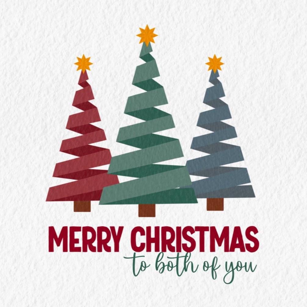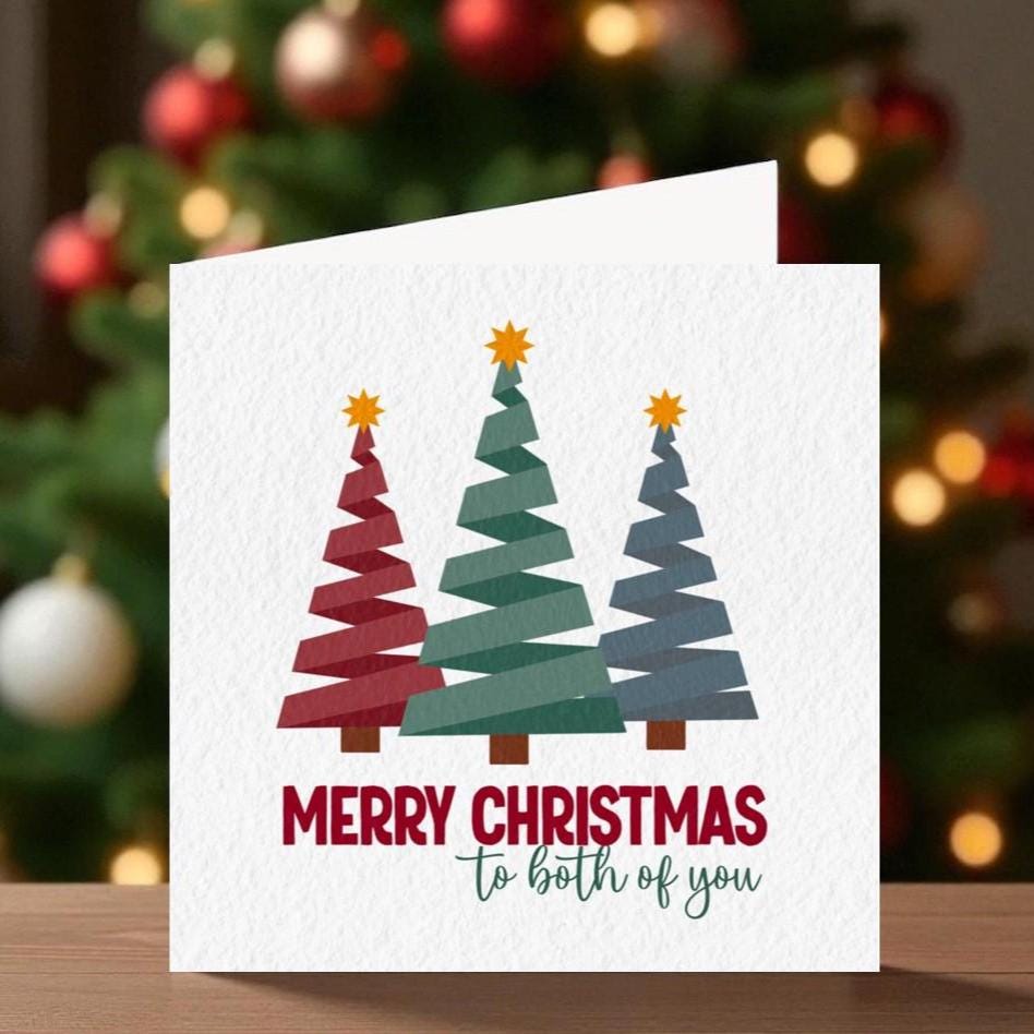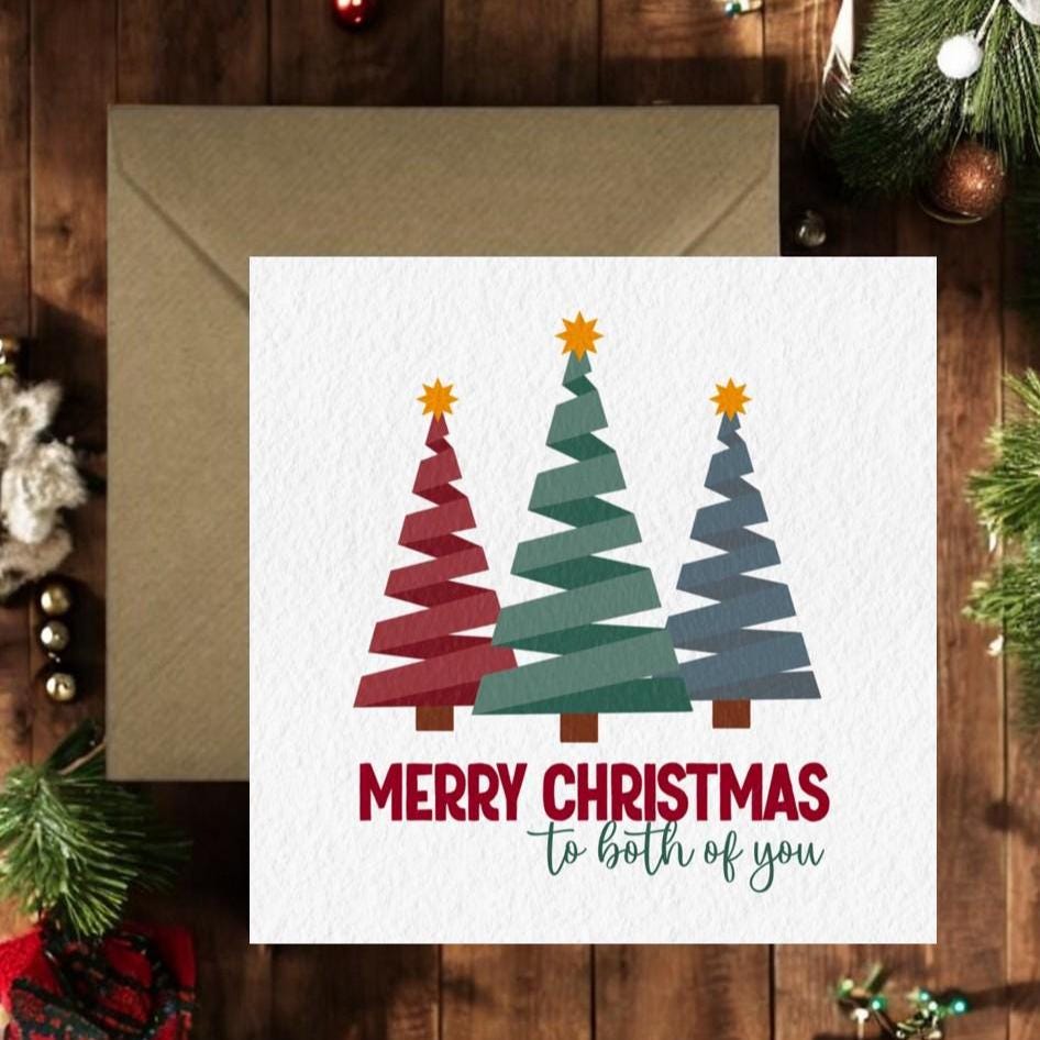This classic Christmas card features three elegant trees and is perfect wishing a Merry Christmas to a couple. It is an original Blue Trousers design, which is printed in the UK on high quality, sustainably sourced 324gsm card. This Christmas card measures 5.5 by 5.5 inches (14cm by 14cm), is supplied with a brown recycled kraft paper envelope, and comes safely packaged in a biodegradable plastic wrapper. Printed on the inside of the card is the message "Merry Christmas".