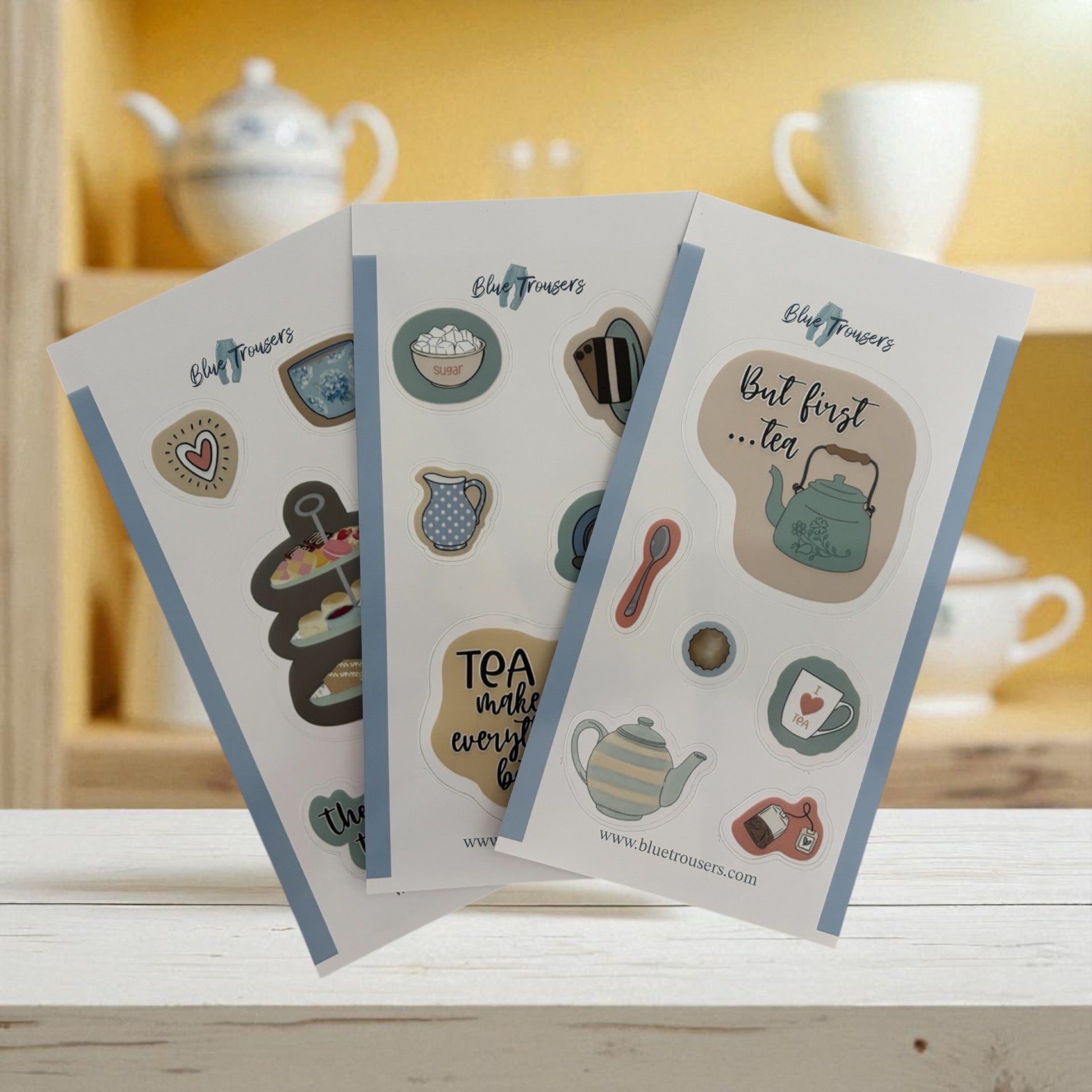 Sixteen tea-themed colour kiss cut vinyl stickers, designed and printed by us here in the UK. Each colour sticker is a different original design. The stickers are supplied on three sheets, are easy to peel and have a long-lasting glue that works well on any smooth surfaces including paper, card, wood, laptops, phone cases, journals, scrapbooks, and water bottles. The vinyl material is durable and water resistant, and the sticker sizes range in size from 2.1cm by 2.1cm to 7.9cm by 6.3cm. Each sheet measures 4” x 7” (approximately 10cm x 18cm).