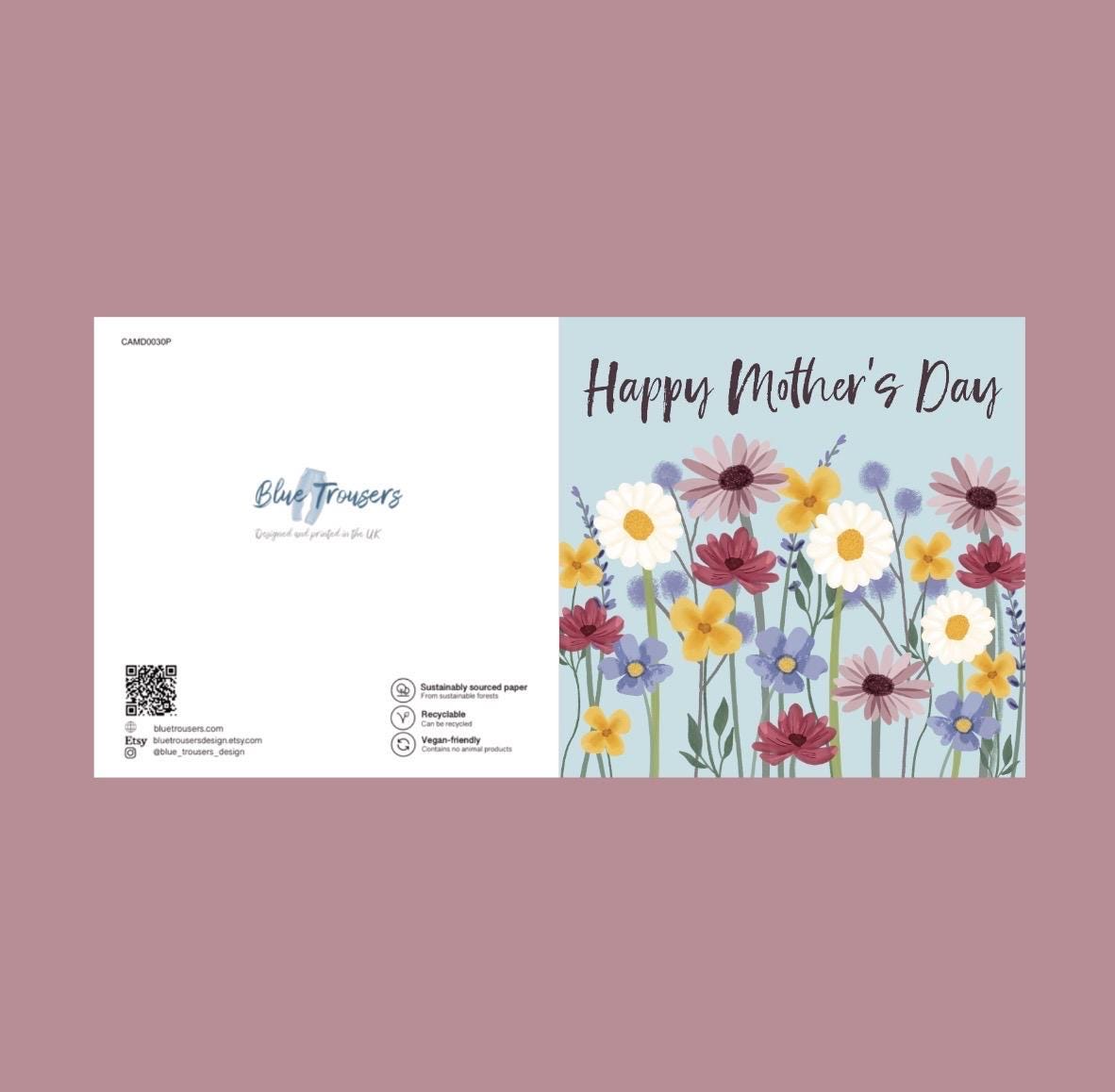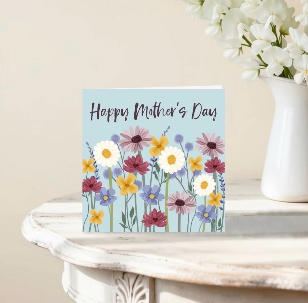 A collection of painted-style wildflowers to send love to your mum this Mother’s Day. This card is an original Blue Trousers design, printed in the UK on high quality, sustainably sourced 324gsm card. The card measures 5.5 by 5.5 inches (14cm x 14cm), is supplied with a brown recycled kraft paper envelope, and comes safely packaged in a biodegradable plastic wrapper. Blank inside for your own message.